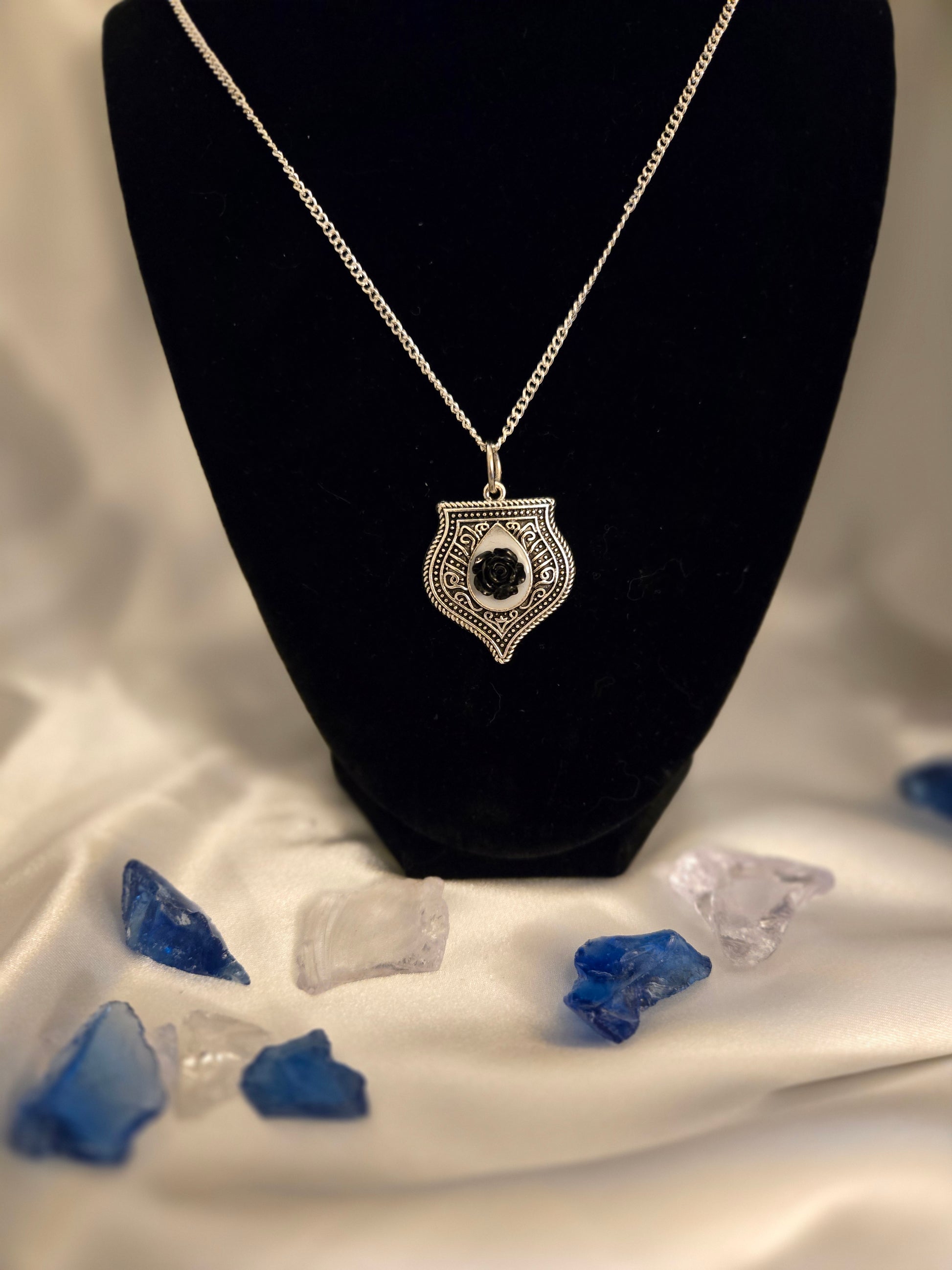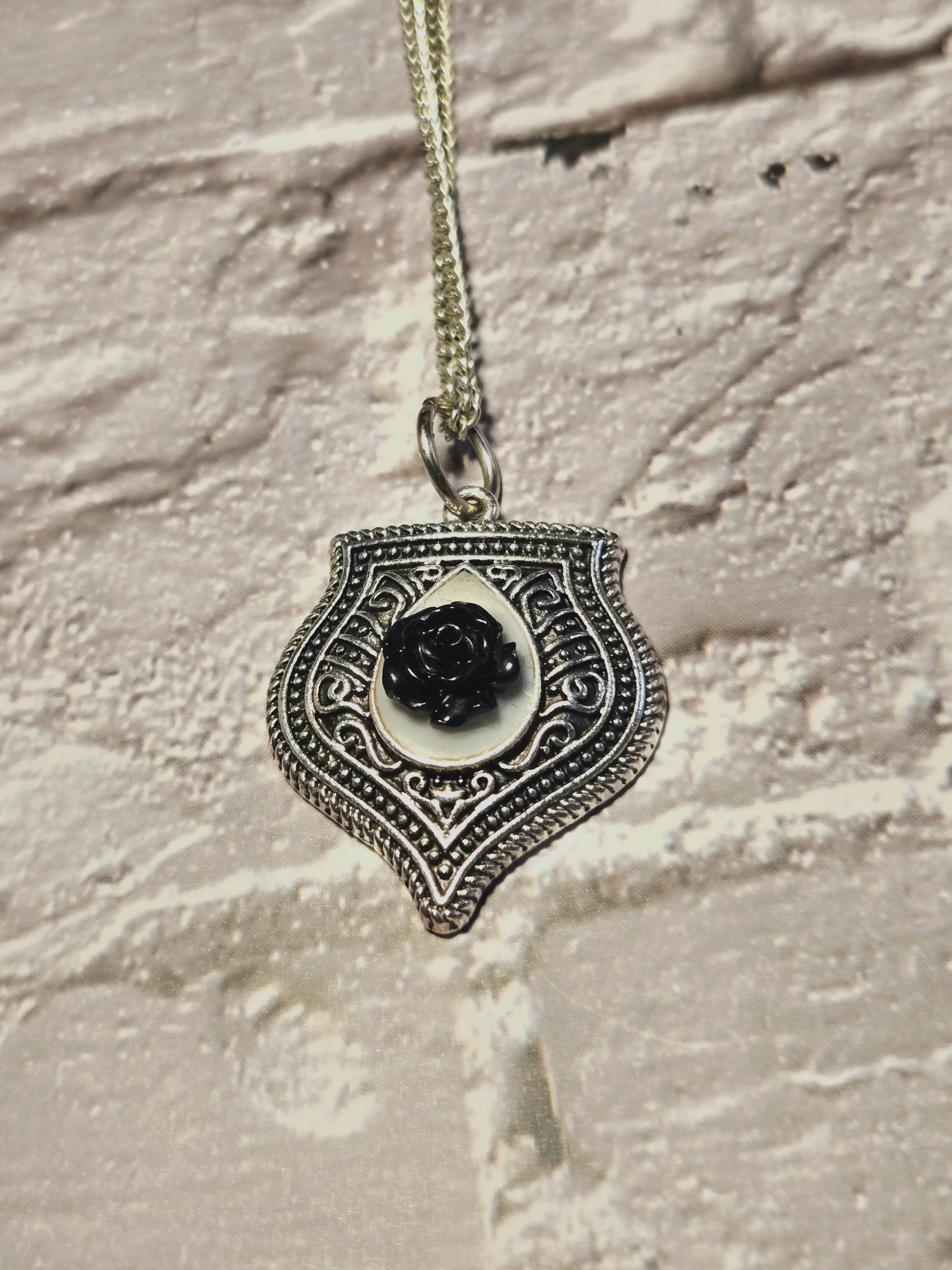 Embrace timeless elegance with a touch of mystery in this vintage-inspired black rose necklace. The striking black resin rose is set within a beautifully detailed silver shield-shaped pendant, evoking a sense of vintage charm with a gothic twist. Perfect for adding a touch of dark romance to any look, this necklace exudes both grace and boldness.