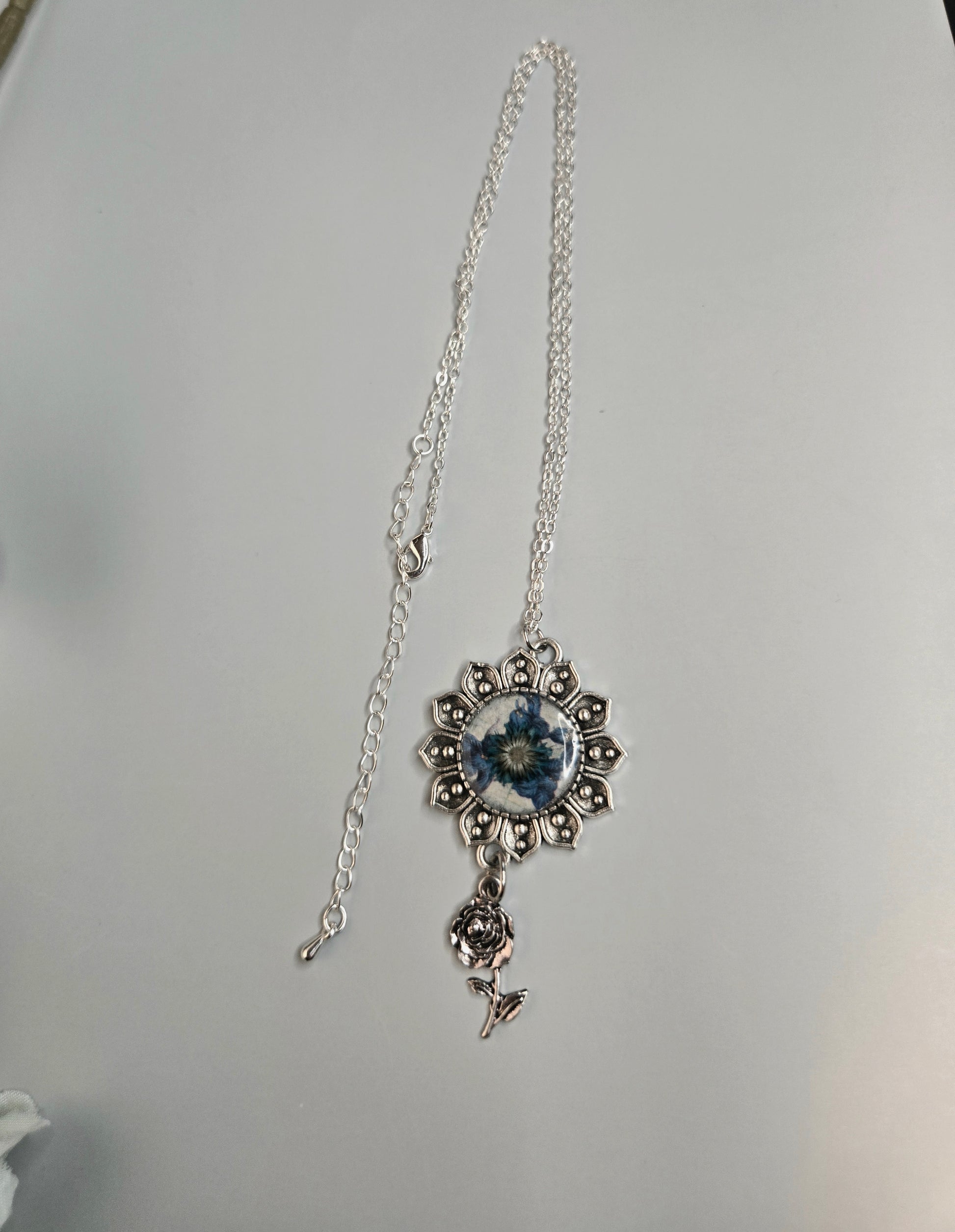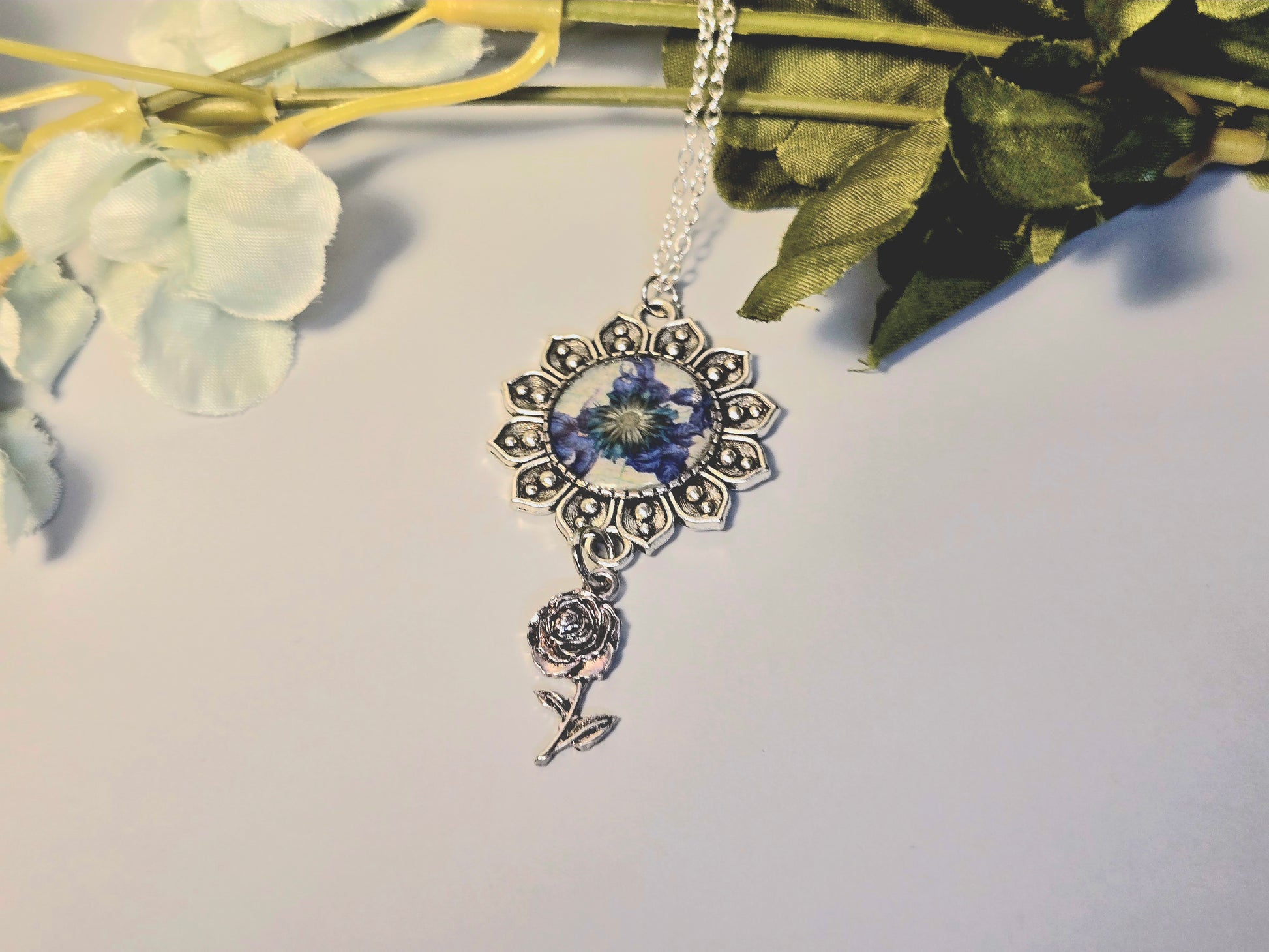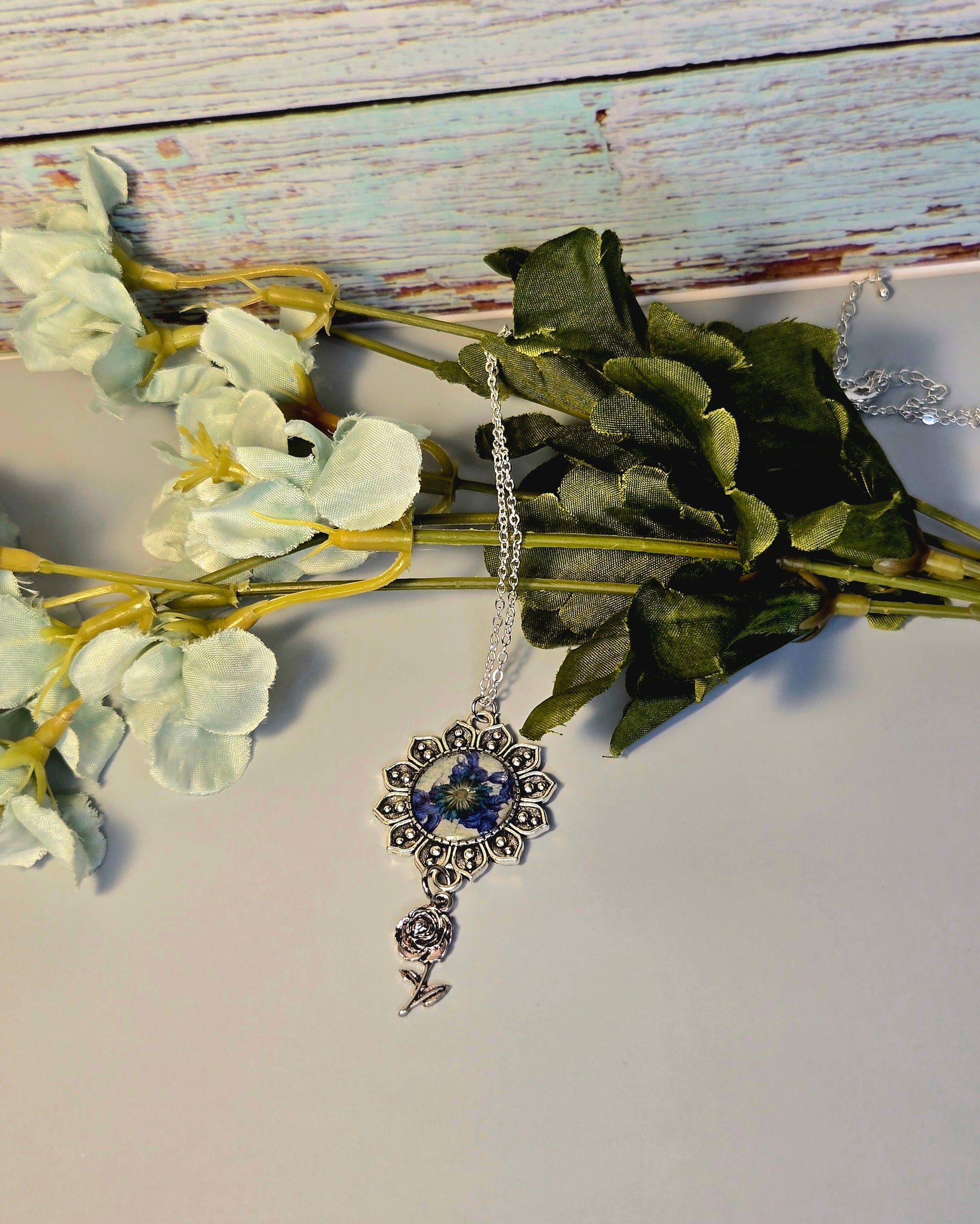 Bring the beauty of nature to your style with this handmade pressed flower necklace, featuring a real blue flower preserved in crystal-clear resin. The floral cabochon is set in an ornate vintage-inspired silver pendant and paired with a delicate dangling silver rose charm.