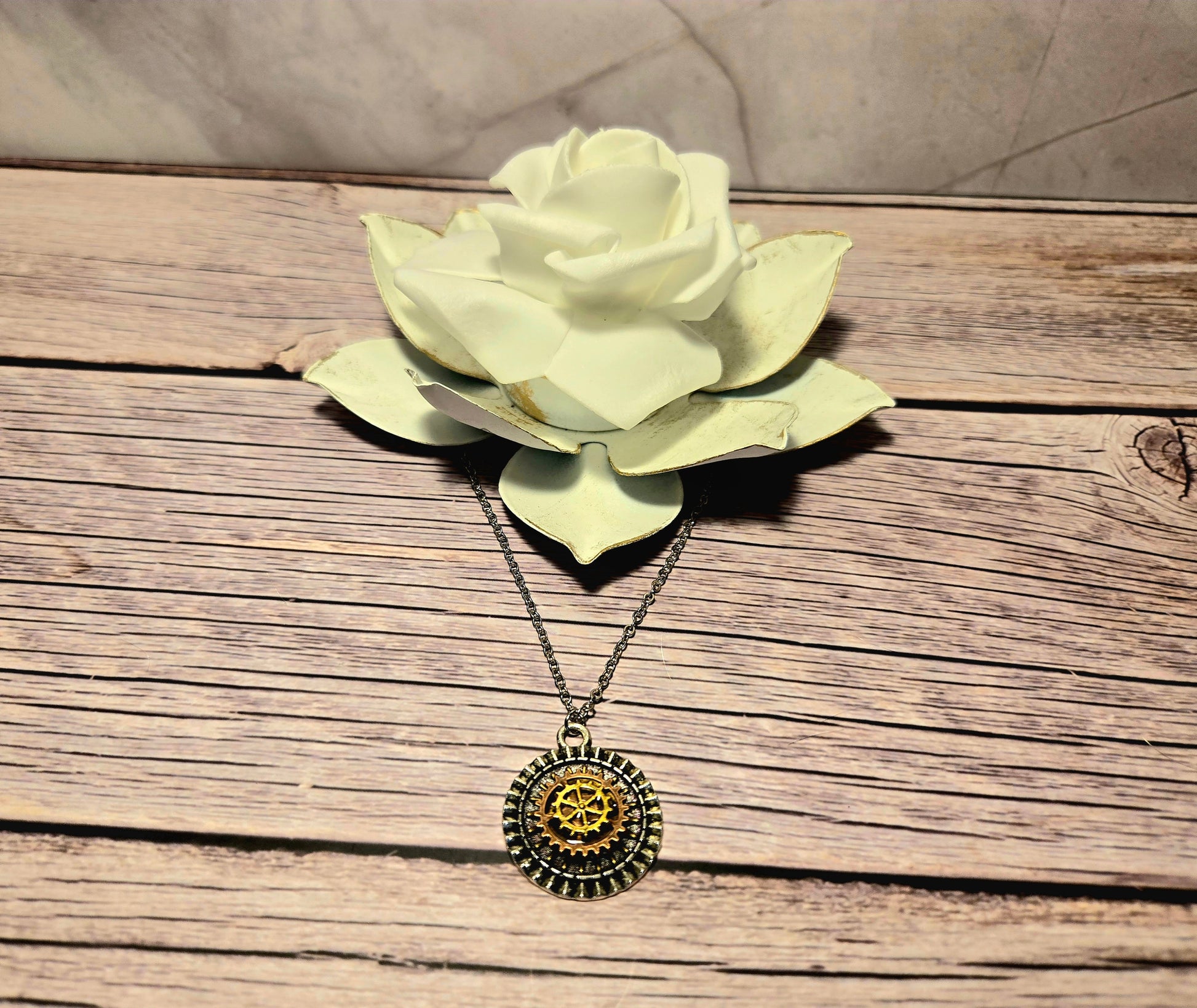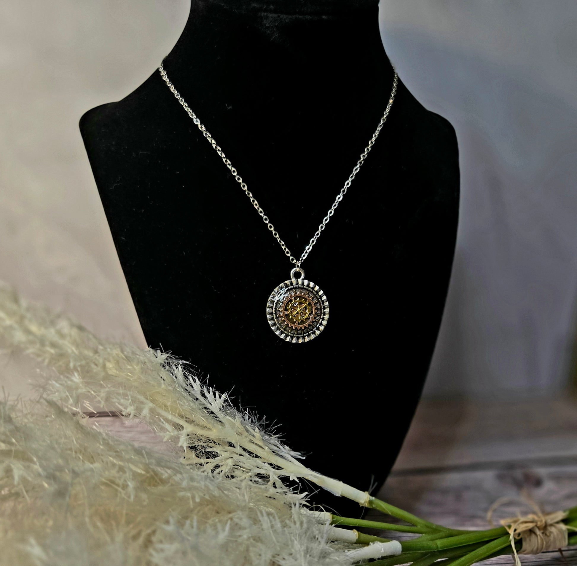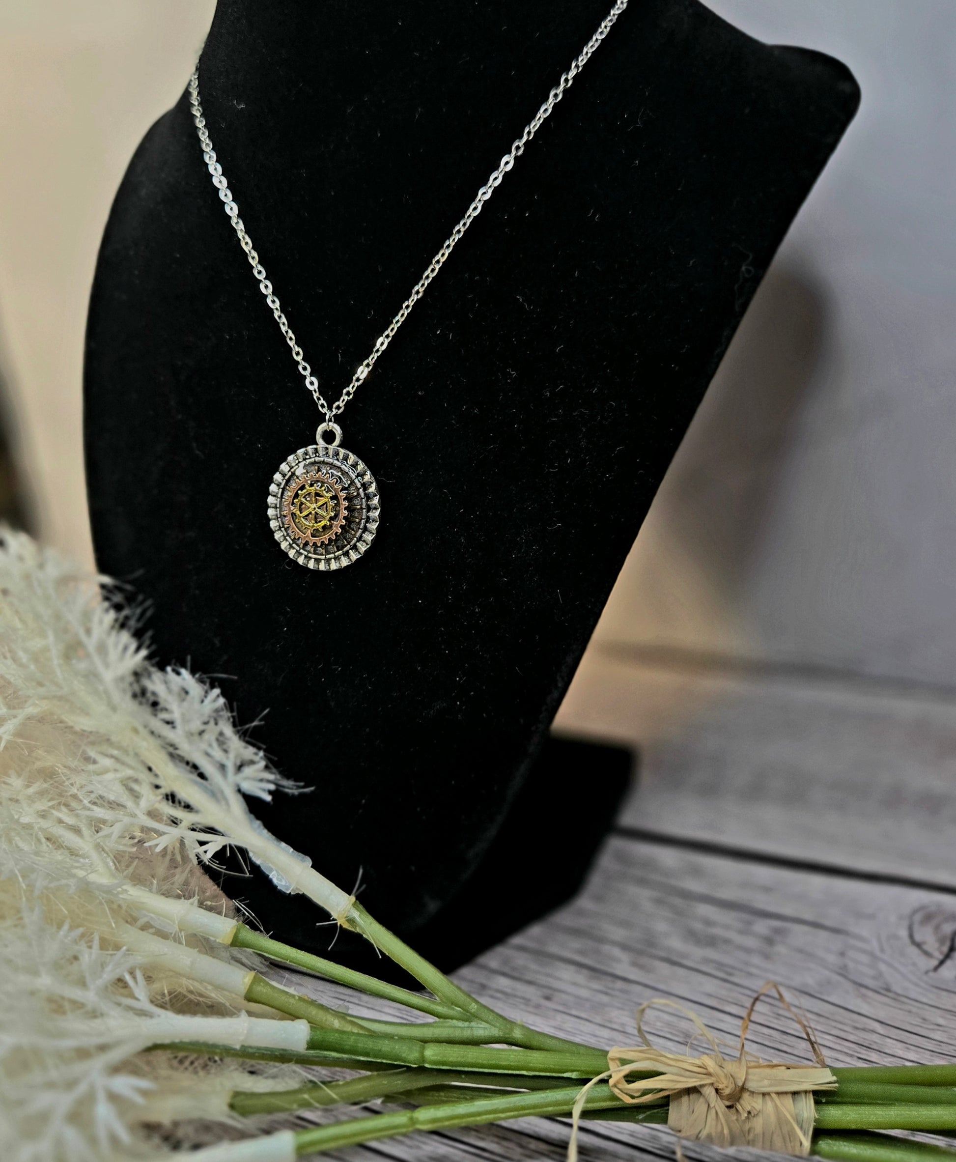 Celestial Gear Pendant Necklace – Vintage Brass & Crystal Industrial Charm