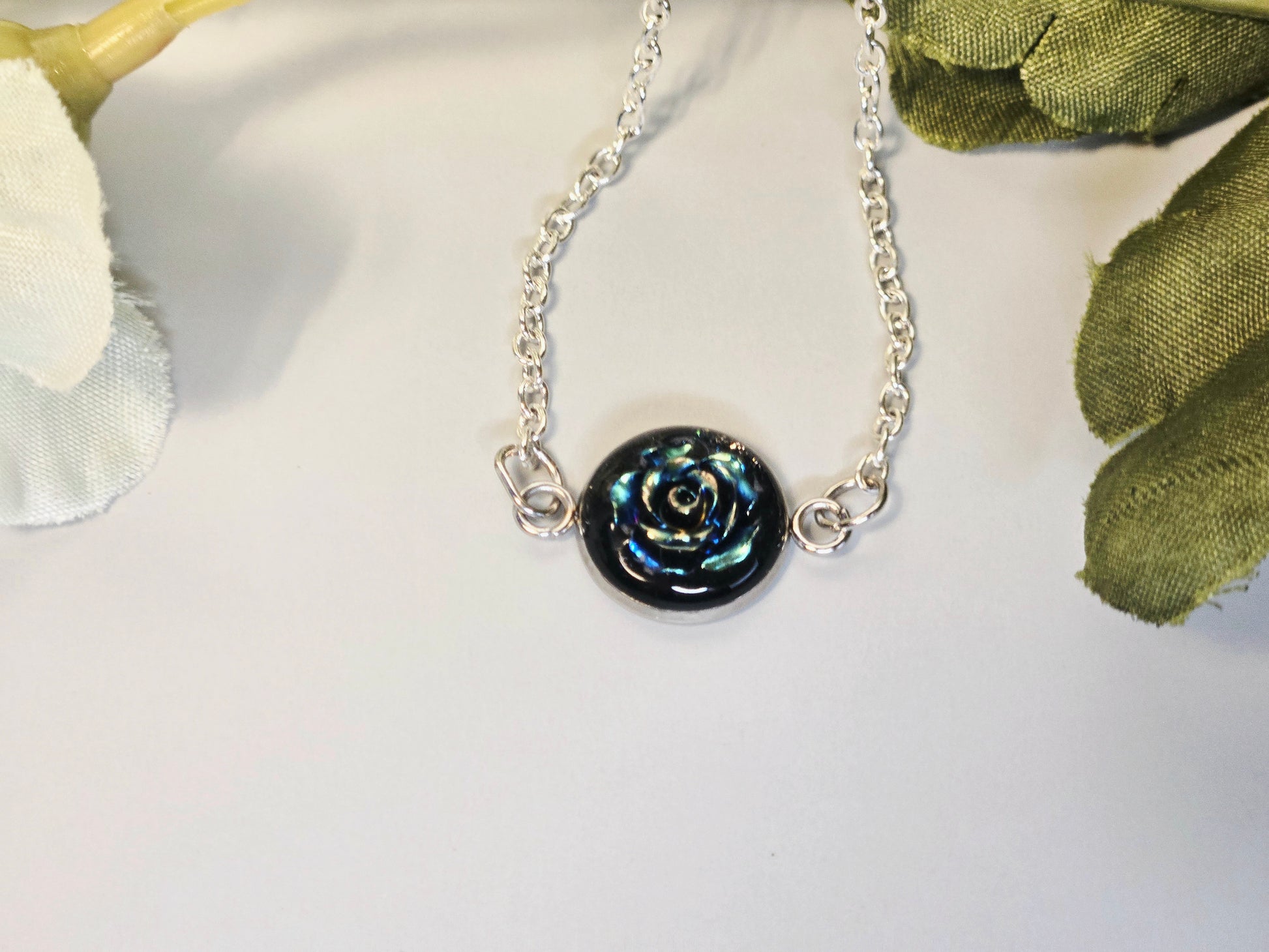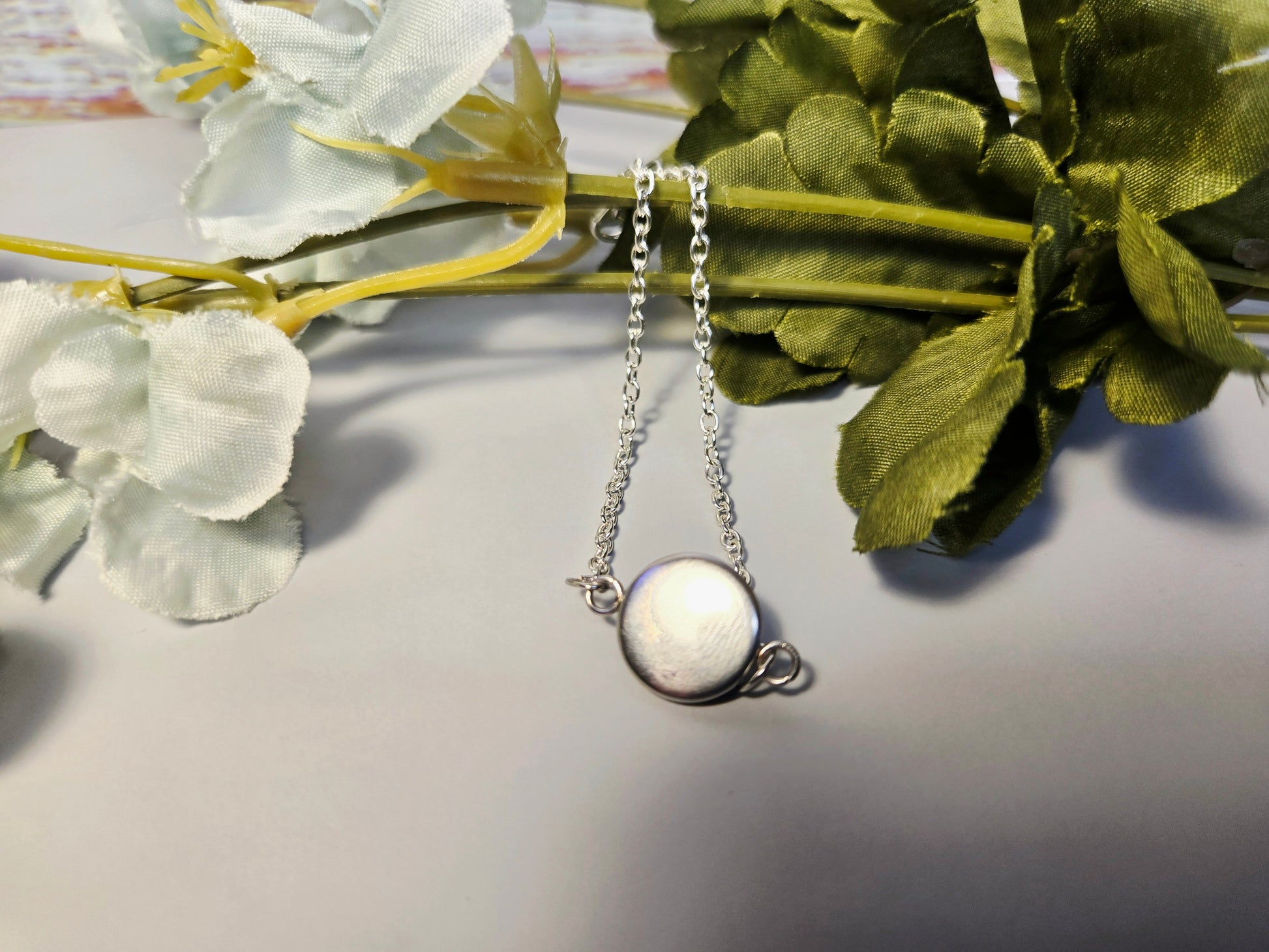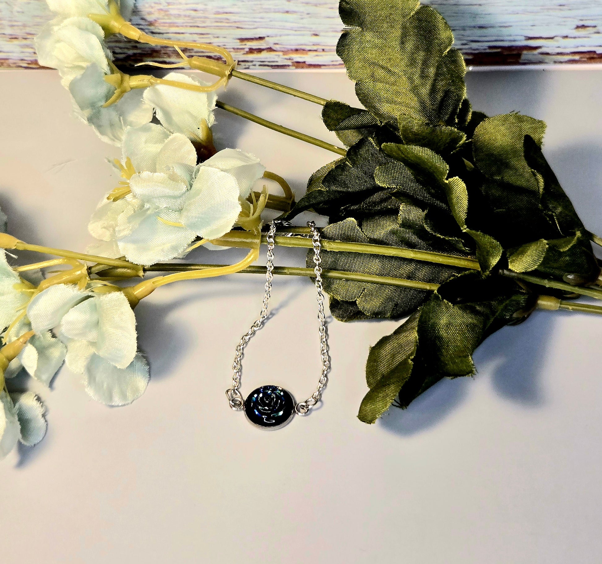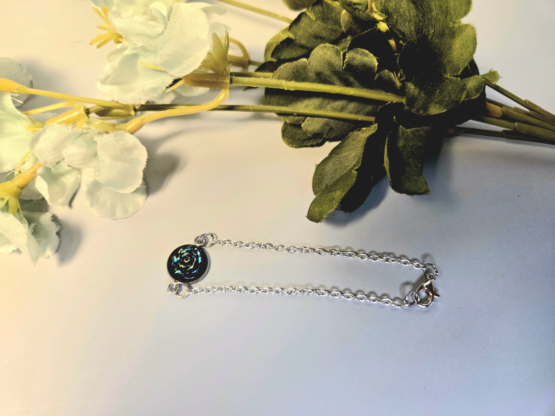 Elevate your everyday style with this delicate silver chain bracelet, featuring a stunning round iridescent glass bead at its center. The bead’s soft swirl design reflects rainbow hues as it catches the light, adding a touch of shimmer and elegance to your look.