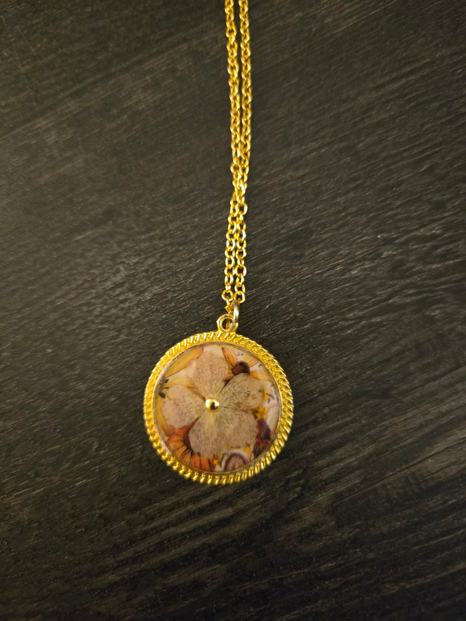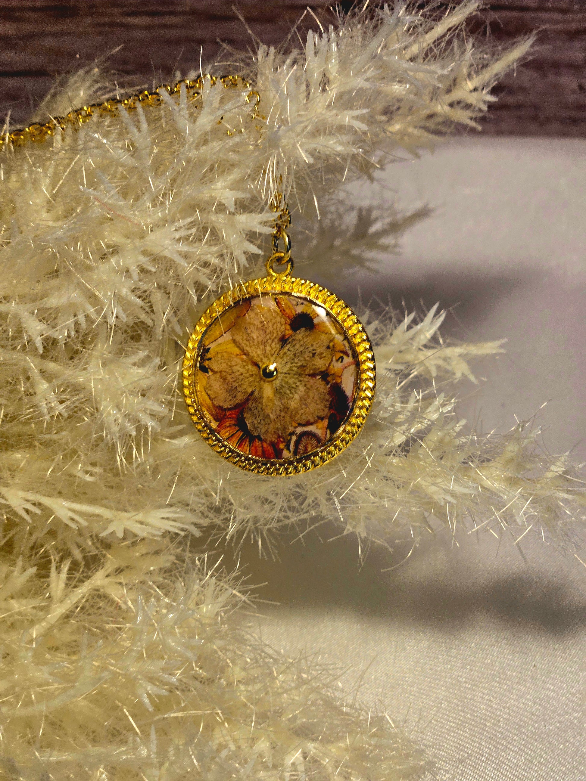 Golden Bloom Necklace – Romantic Pressed Flower Pendant with Pearl Center