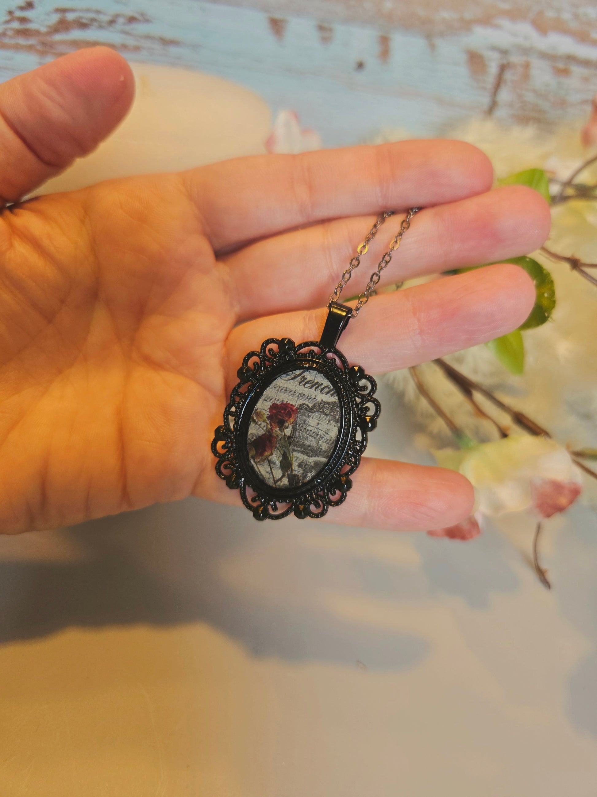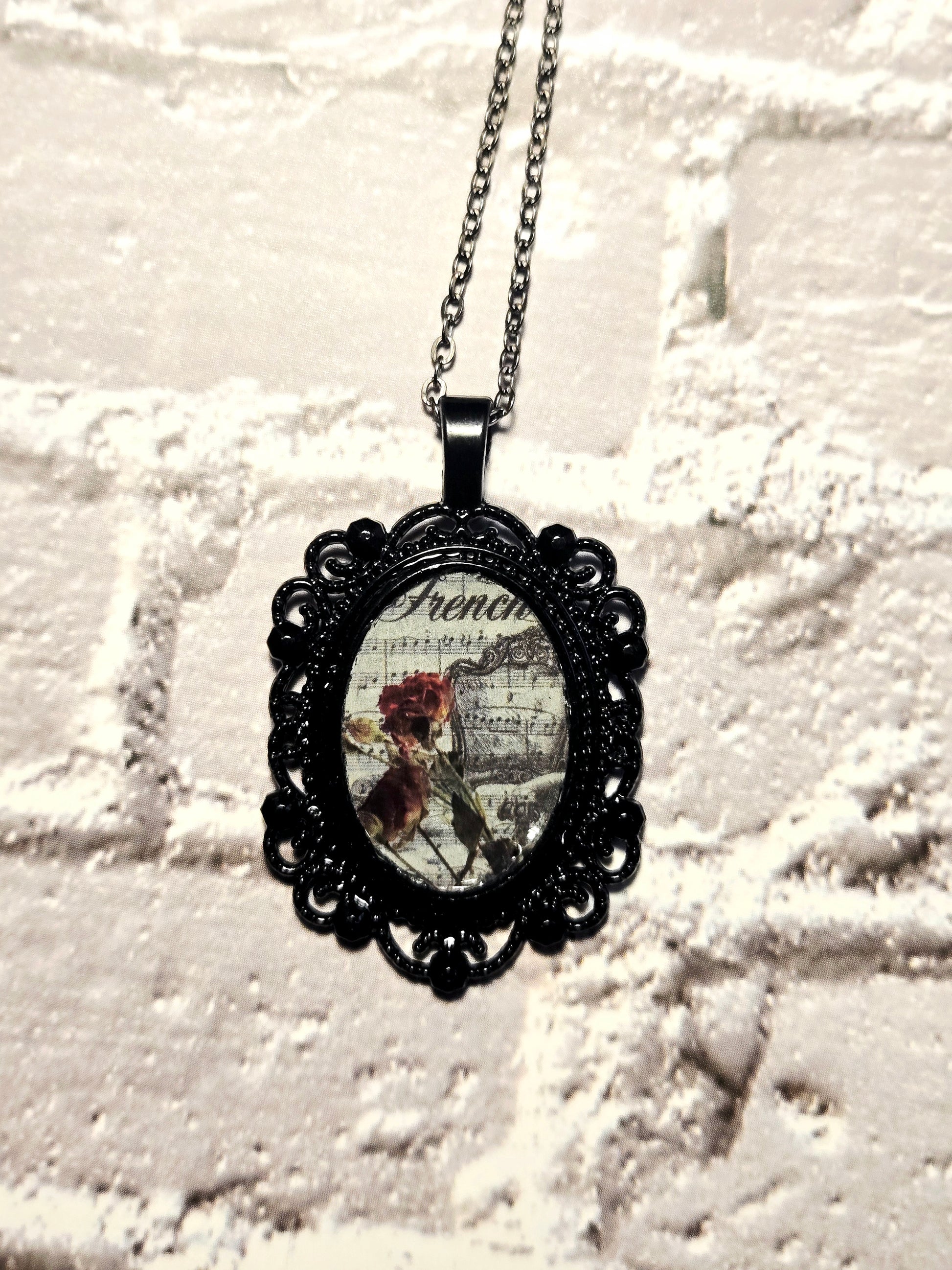 The Gothic Victorian Rose Necklace is a hauntingly elegant piece that captures the dark romance of another era. Set in an ornate black frame, this pendant showcases deep crimson roses against vintage-style French script — a timeless tribute to love, memory, and the poetry of decay.