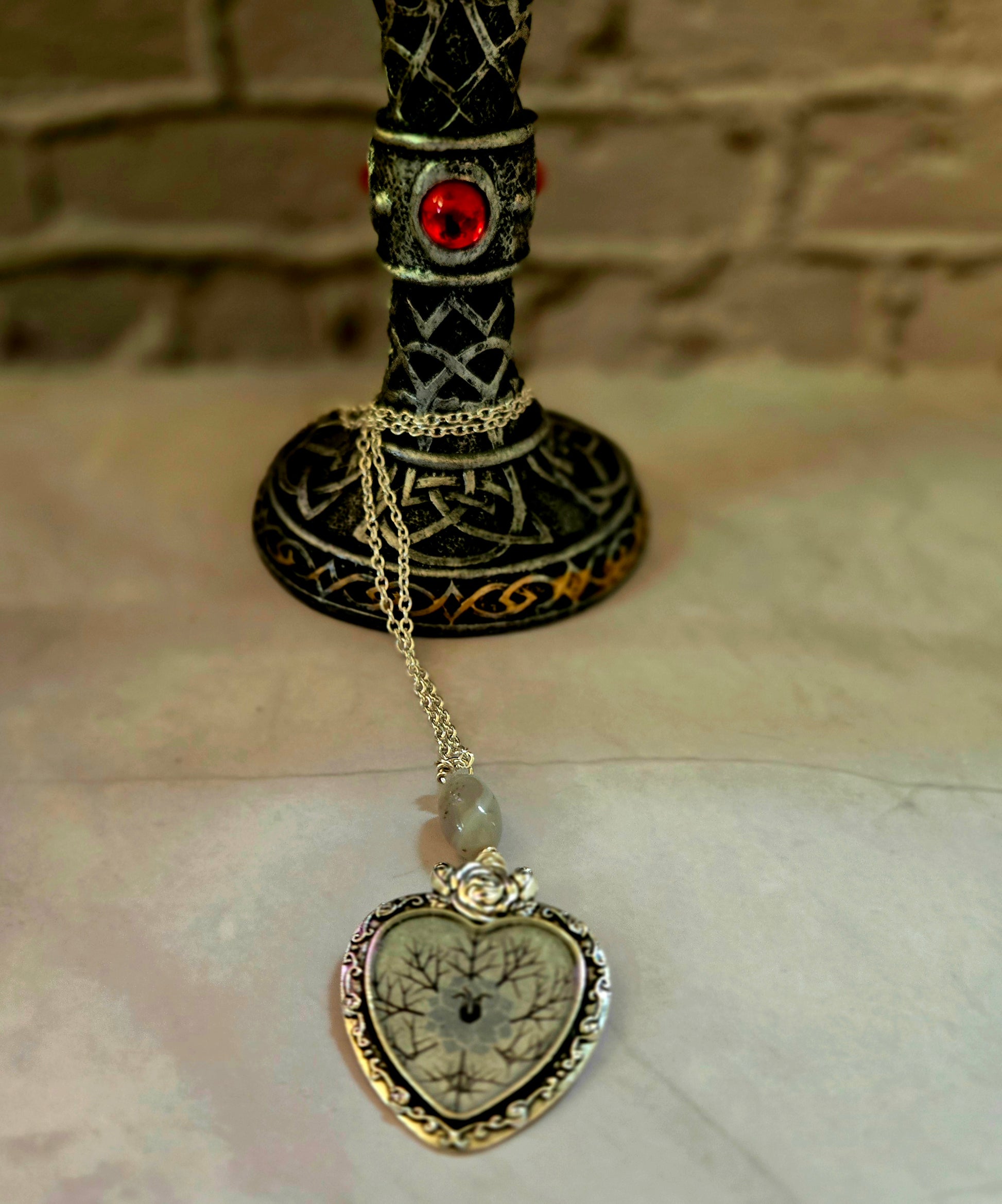 This handmade necklace features a heart-shaped pendant framed in elegant silver with a unique tree and floral design at the center. Topped with a smooth natural stone bead and rose detail, this piece blends nature-inspired artistry with timeless charm.