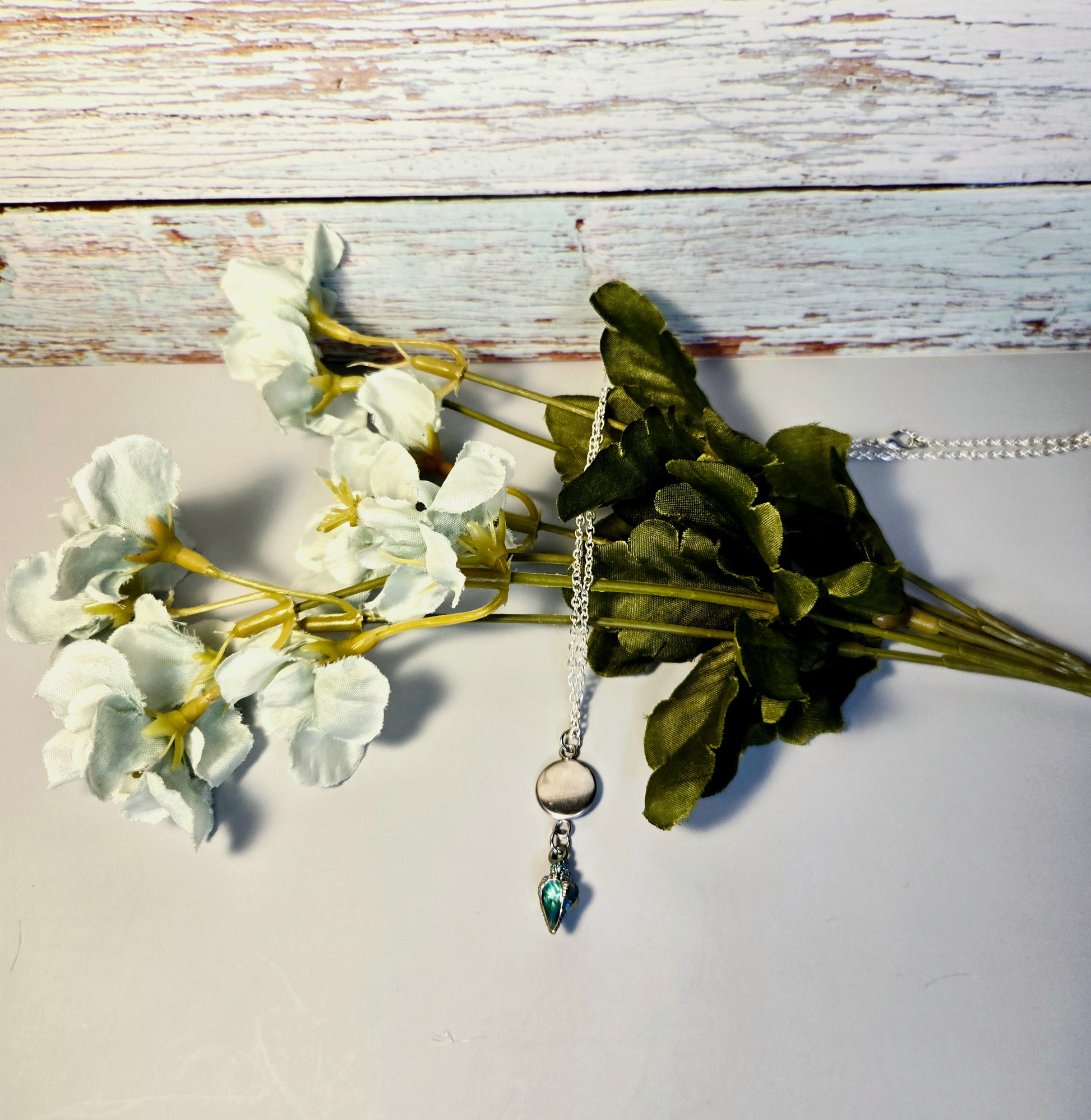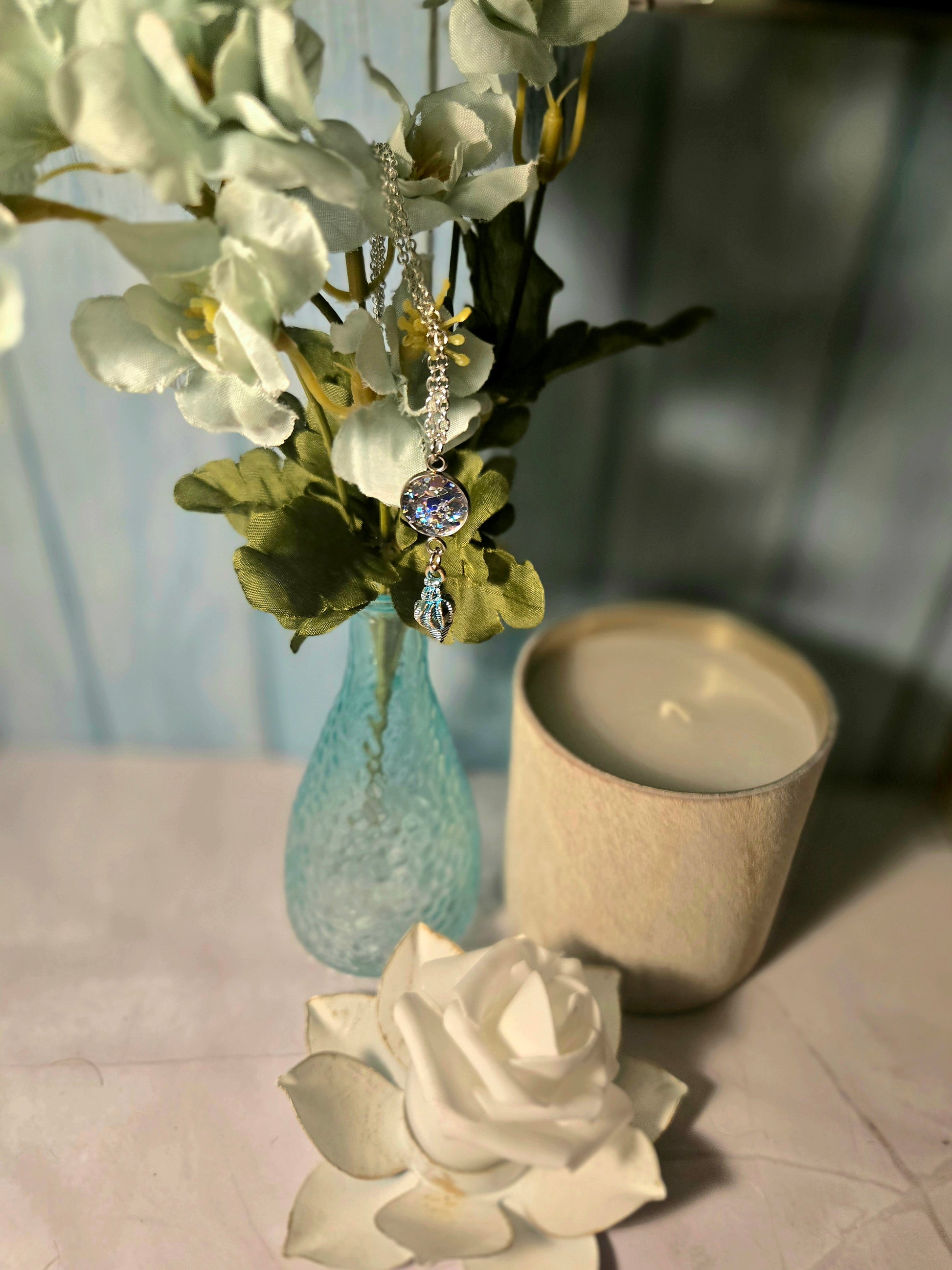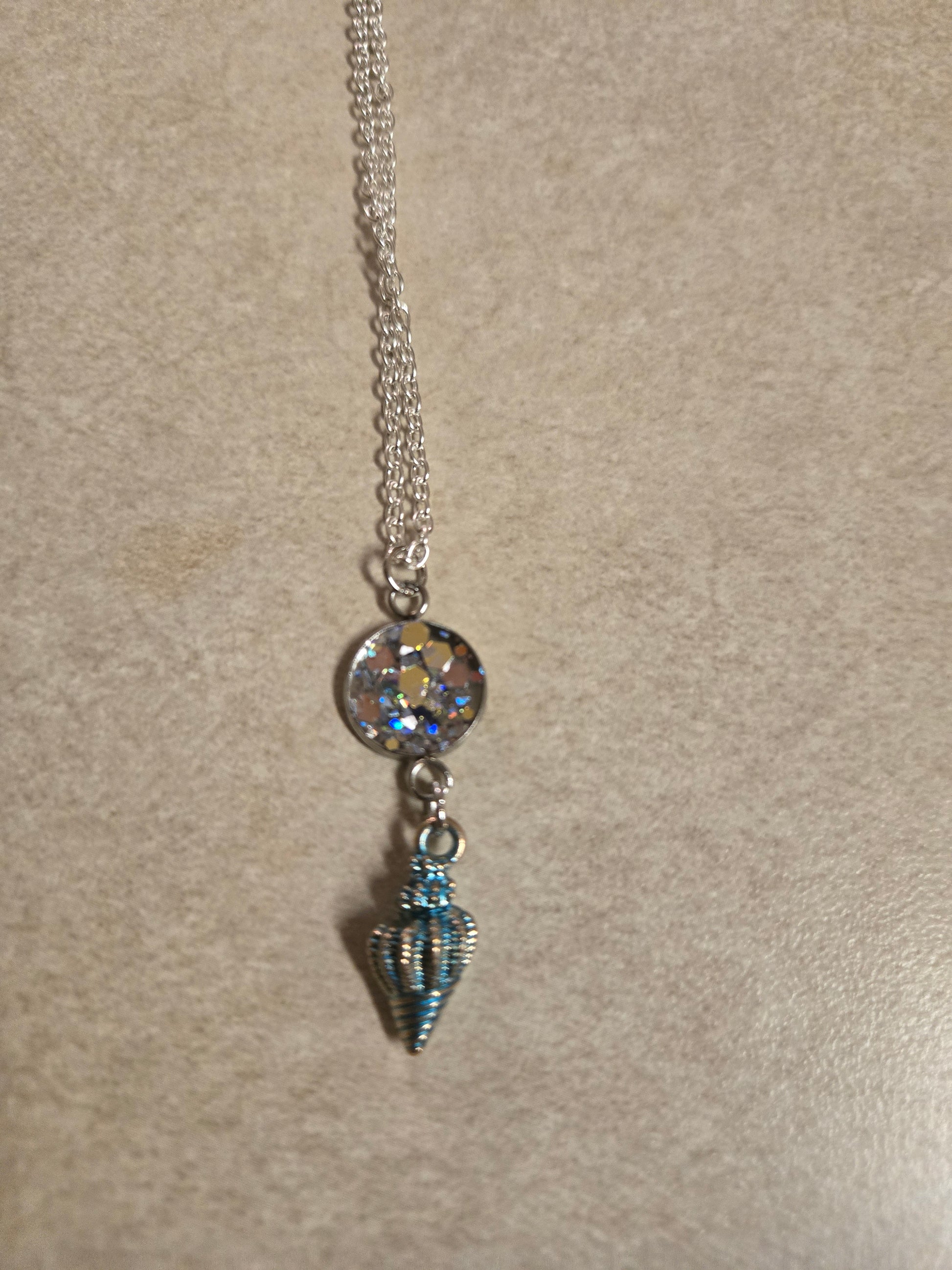 Carry the beauty of the sea and the brilliance of the stars with this unique OES-inspired necklace. A shimmering round pendant catches the light with dazzling iridescence, while a detailed turquoise seashell charm dangles below, symbolizing wisdom, journey, and harmony.