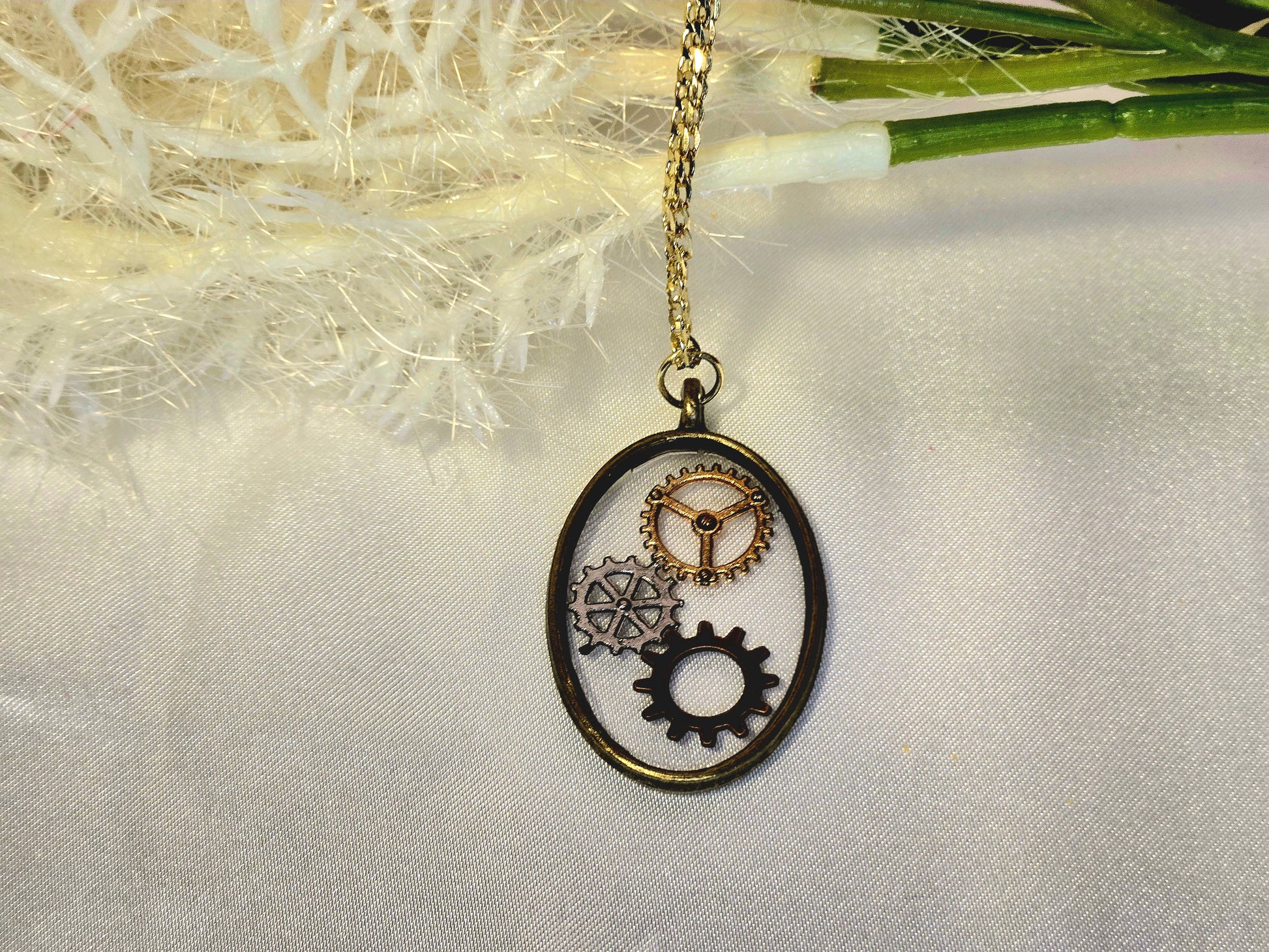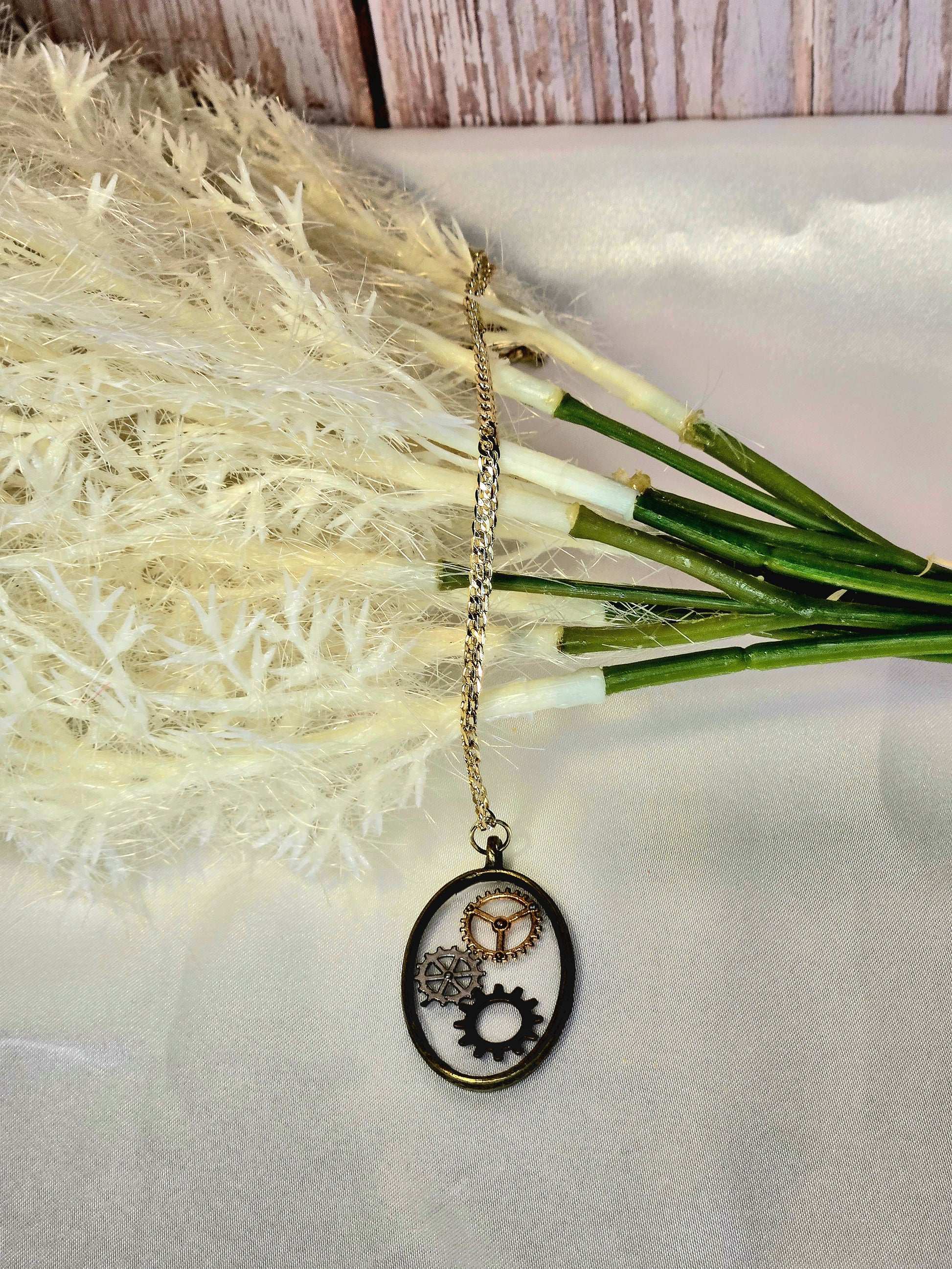 Add a touch of industrial charm to your style with this steampunk-inspired necklace, featuring intricately placed metal gears inside a sleek oval resin pendant. With a blend of bronze, copper, and silver gears, this unique piece creates an eye-catching combination of vintage and mechanical aesthetics.