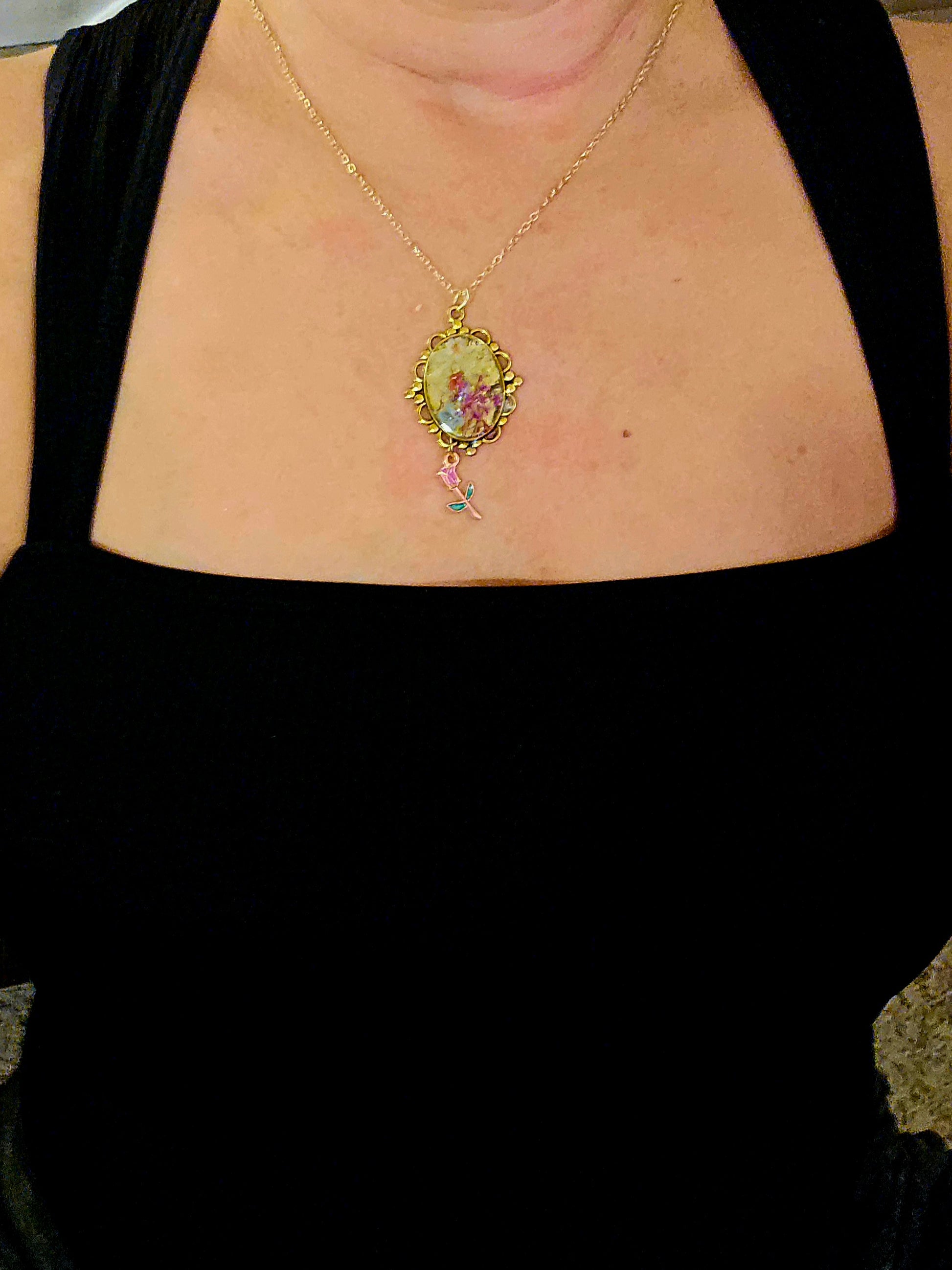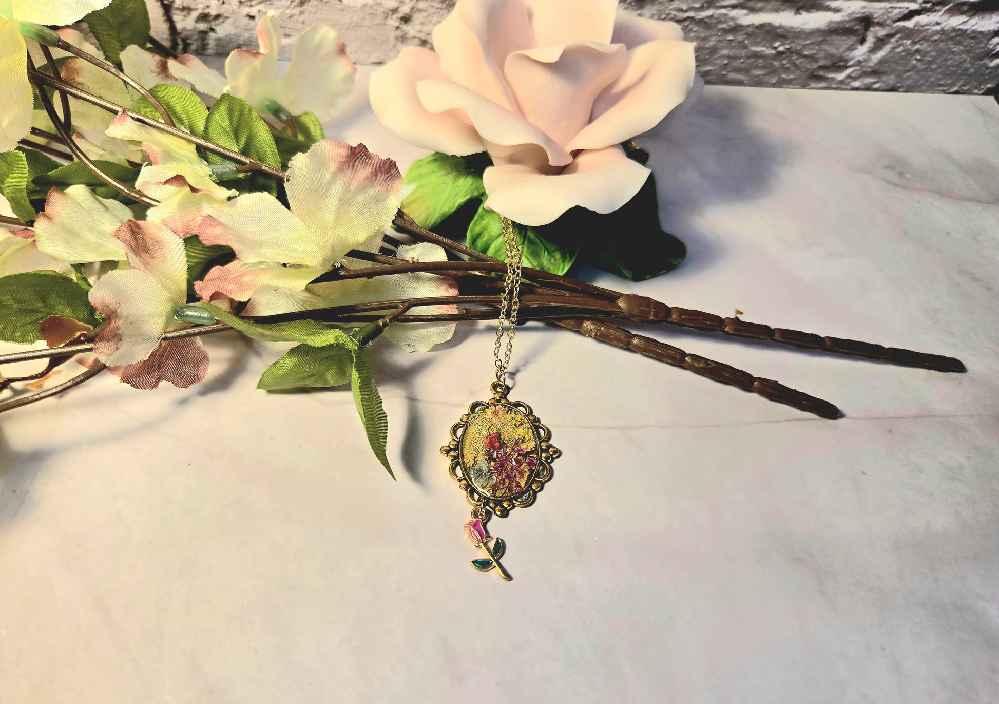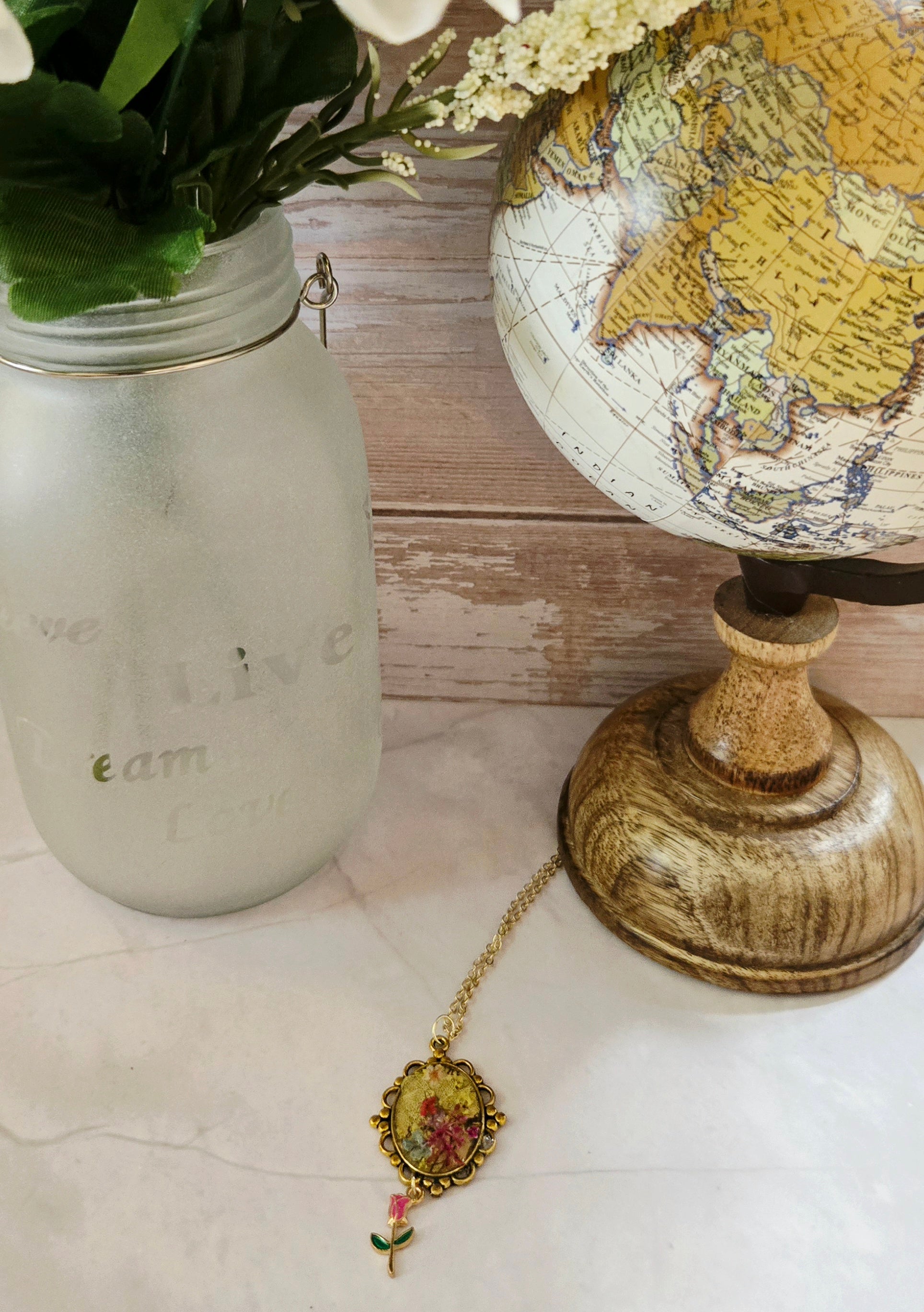 The gold-toned oval pendant features real pressed flowers preserved beneath a smooth glass dome, creating a delicate garden scene with vibrant pinks and soft golden tones.