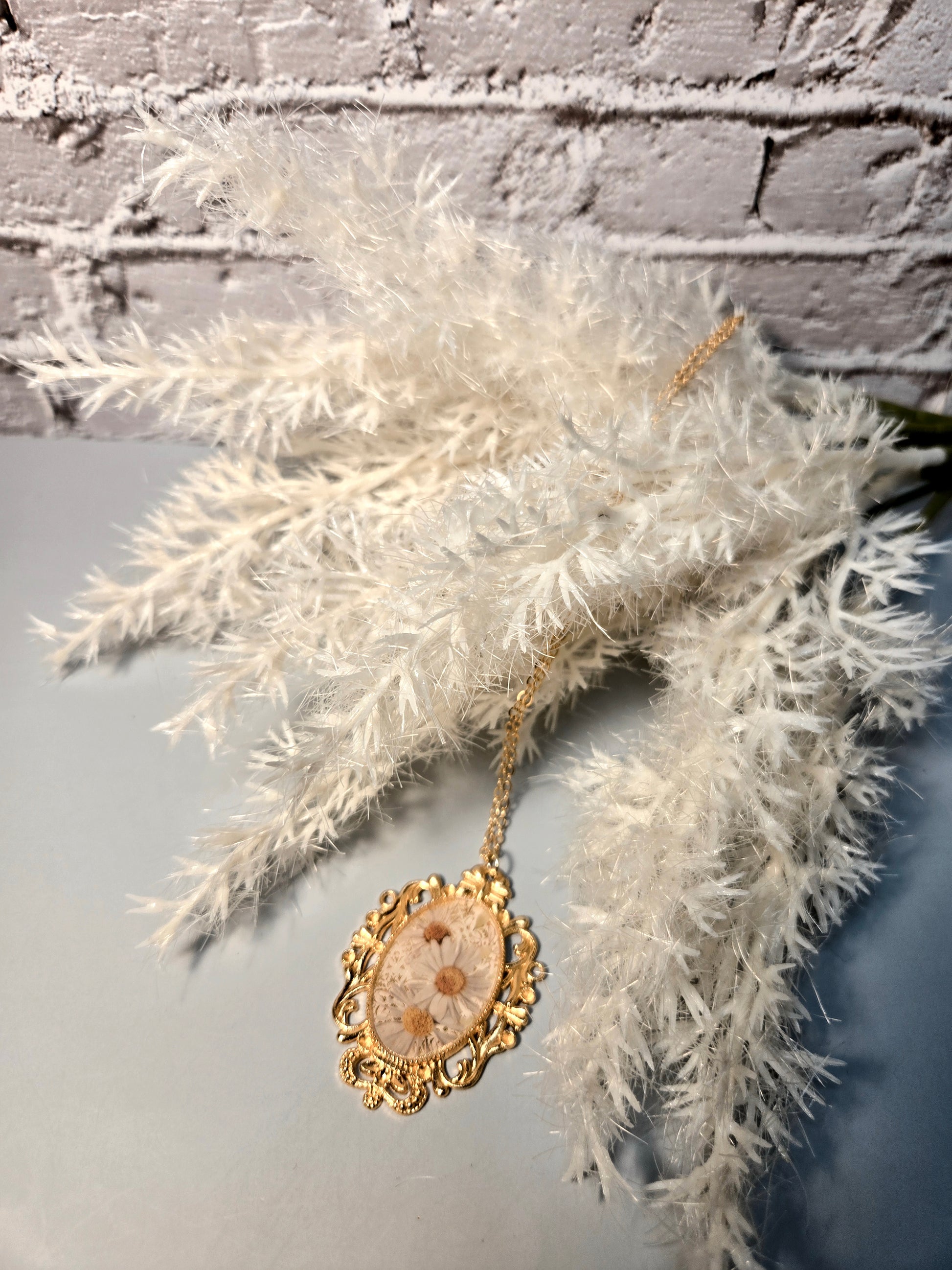 Our Pressed Daisy Vintage Gold Necklace captures the gentle charm of real daisies, preserved beneath a crystal-clear dome and cradled in an ornate golden frame. This piece feels like a cherished locket from a secret garden — feminine, timeless, and full of quiet romance.