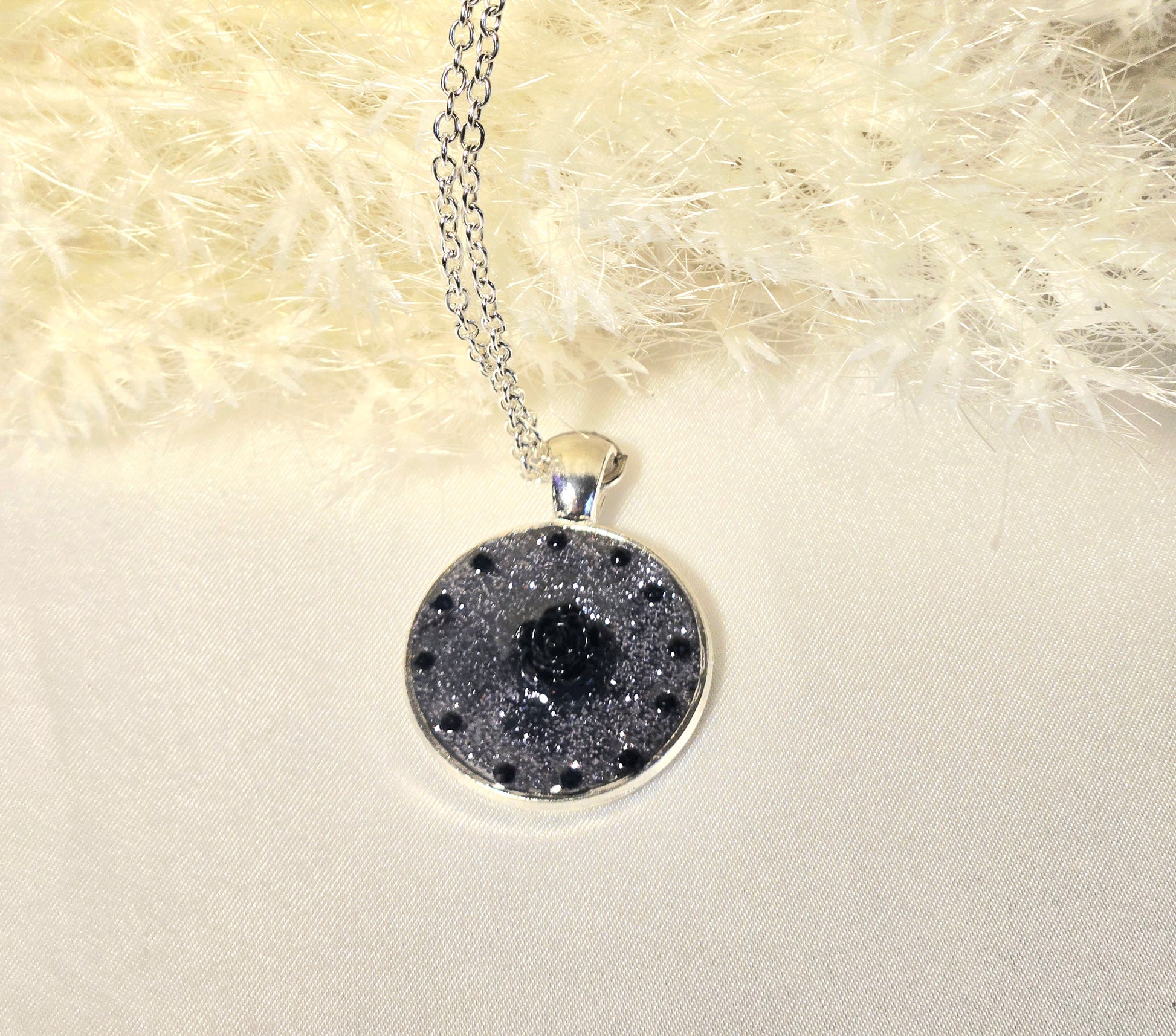 Silver Glitter Pendant Necklace with Black Rose Detail