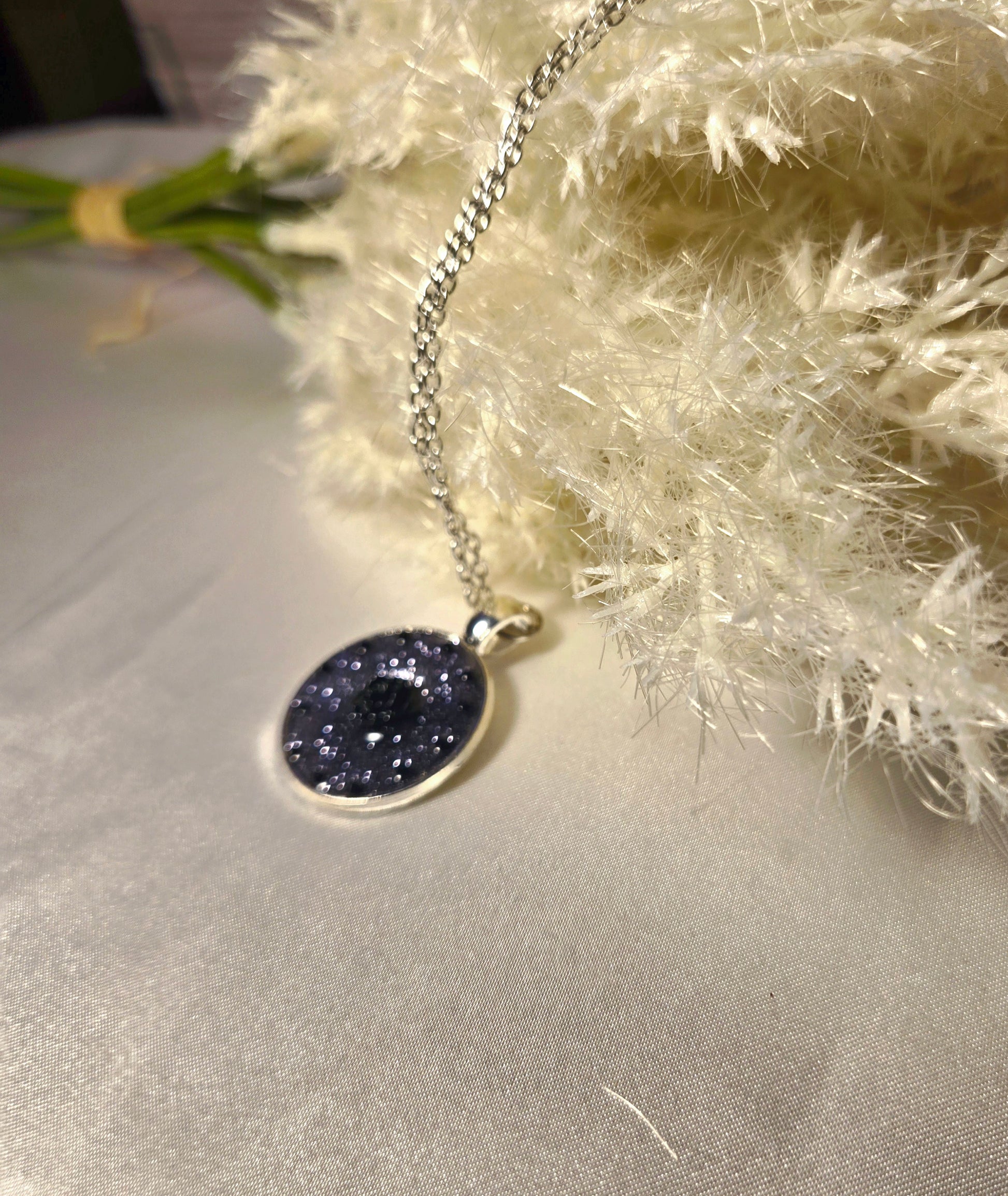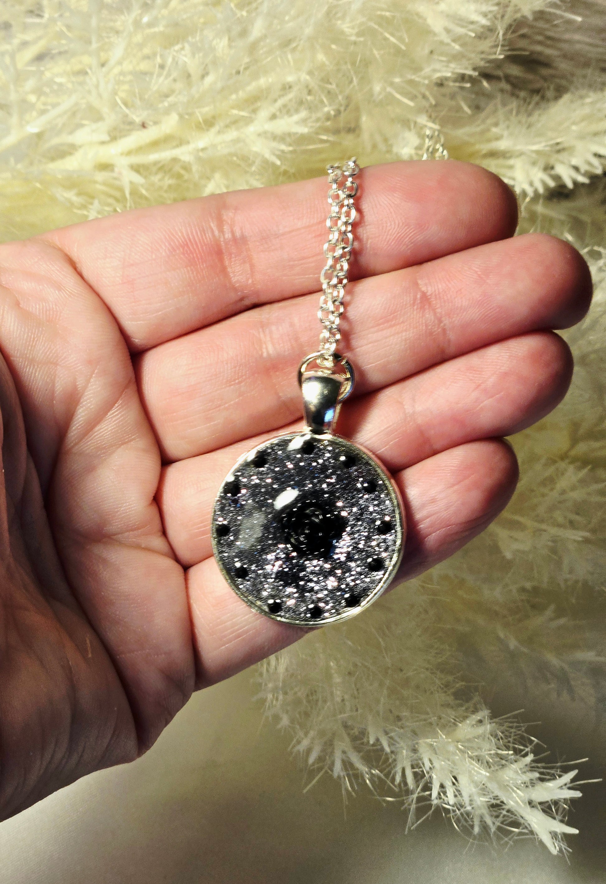 Handcrafted with care, this unique necklace blends shimmering silver glitter with dark floral accents for a striking and sophisticated statement piece. Whether you’re dressing up for a special occasion or adding some glam to your everyday style, this necklace is designed to stand out.