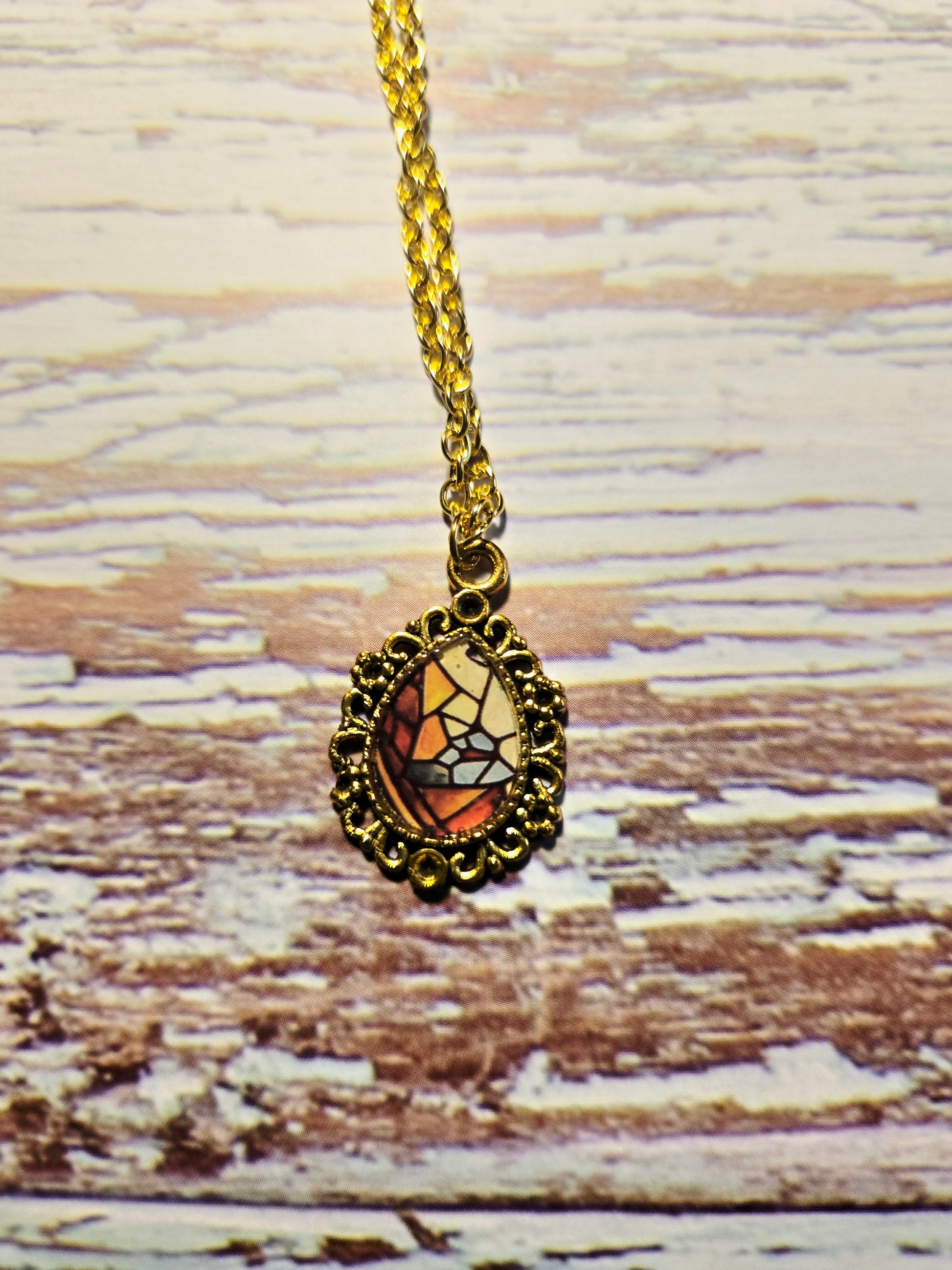 Stained Glass Mosaic Pendant Necklace – Vintage-Inspired Gold Frame on Dainty Chain