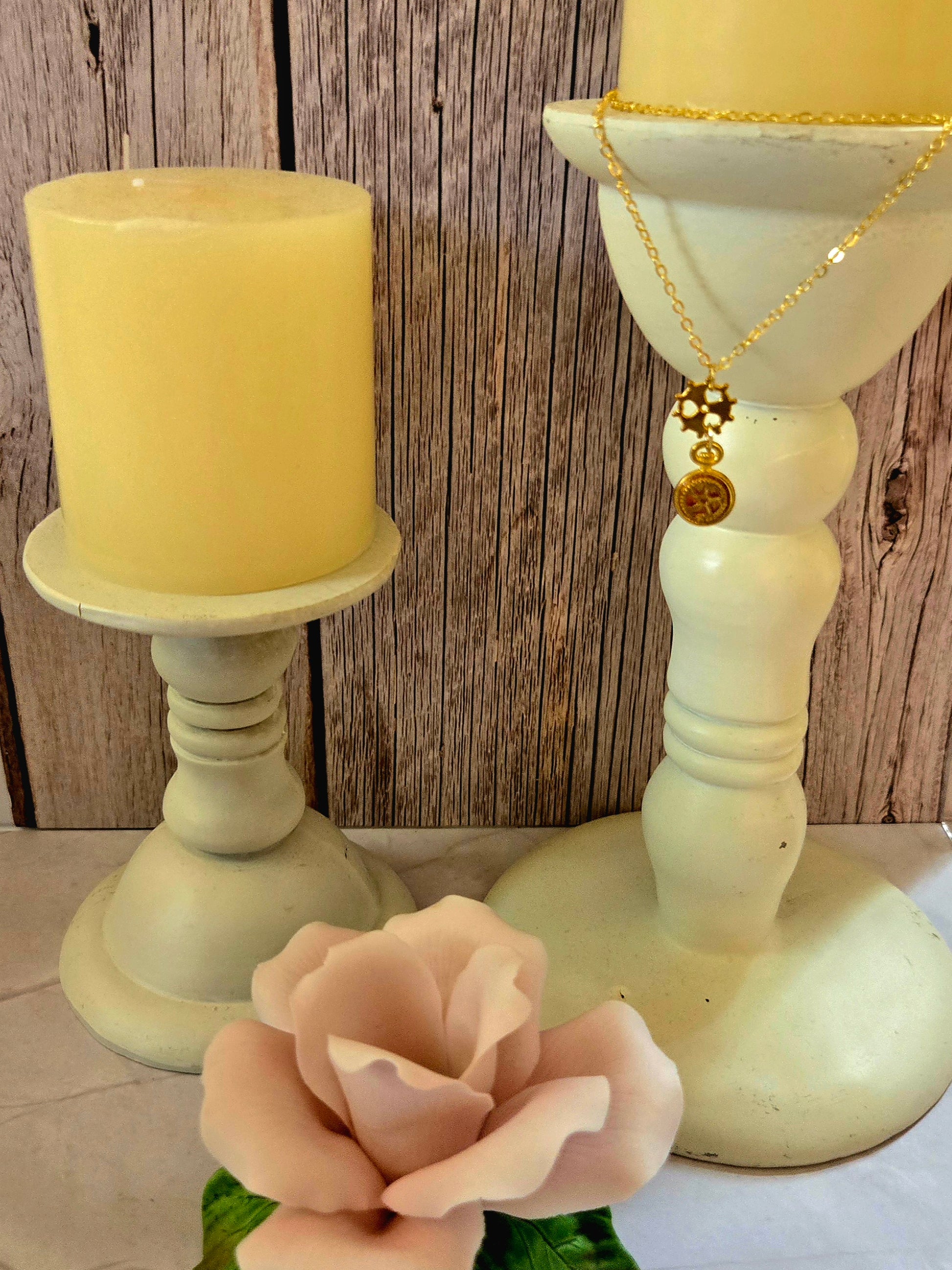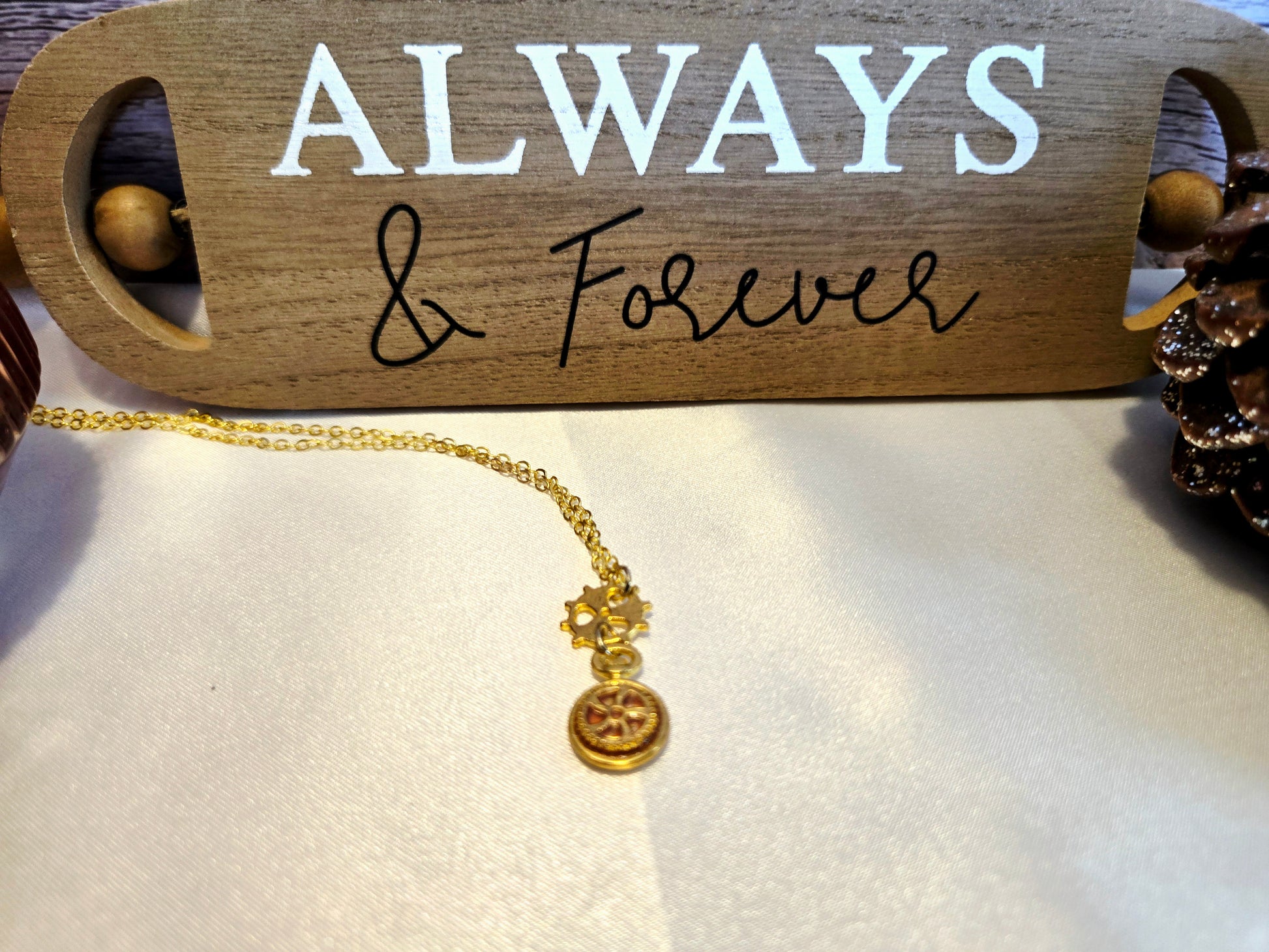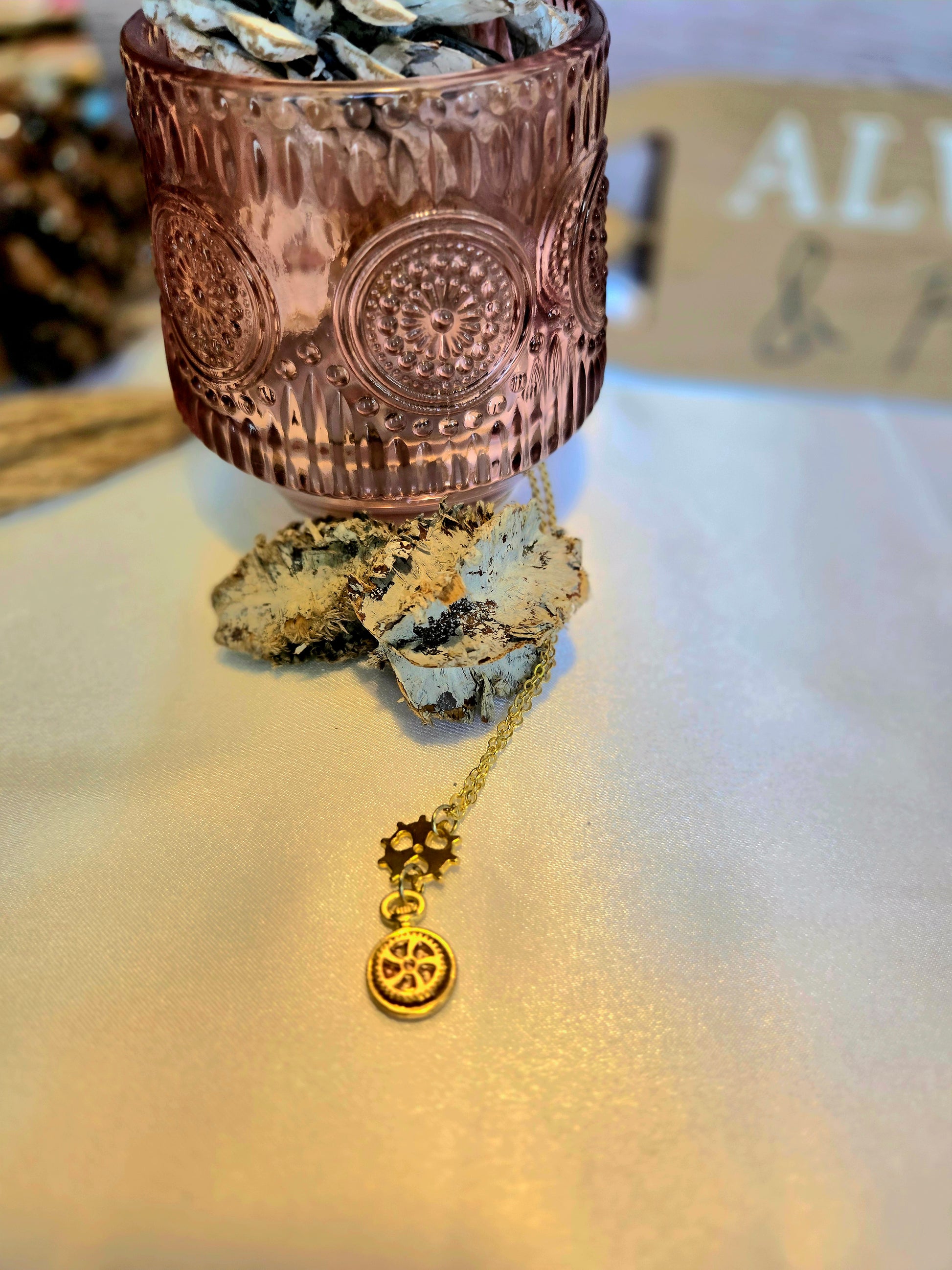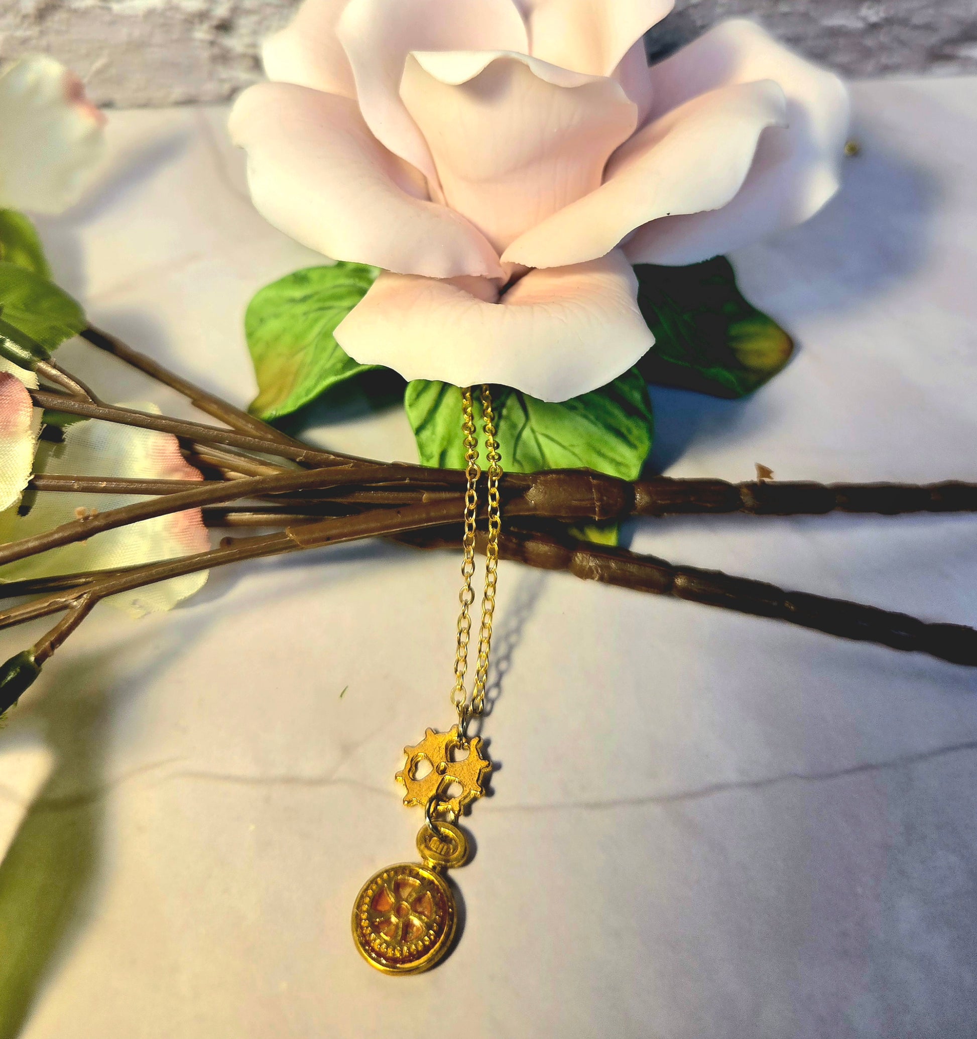 Add a touch of steampunk elegance to your look with this handcrafted gear necklace featuring a miniature pocket watch–style pendant. The gold-tone chain is accented with a detailed gear charm and a vintage-inspired round pendant with a delicate floral design.
