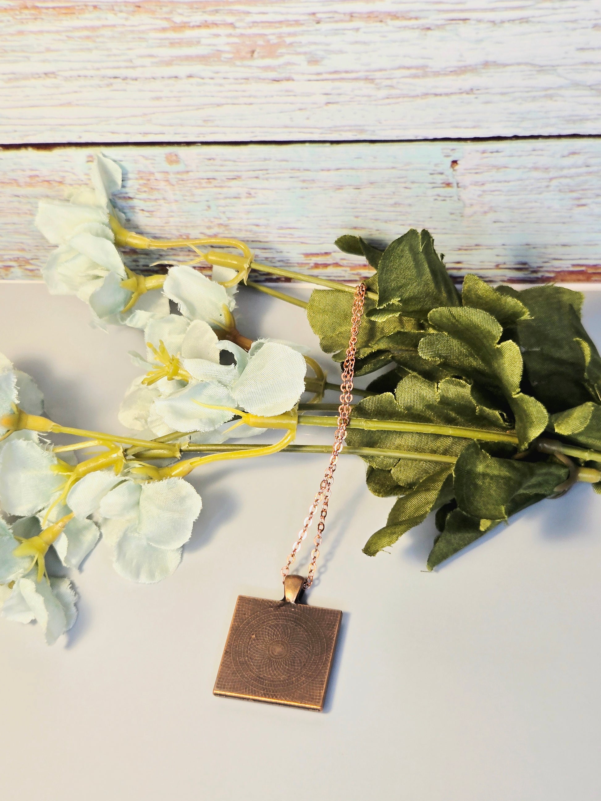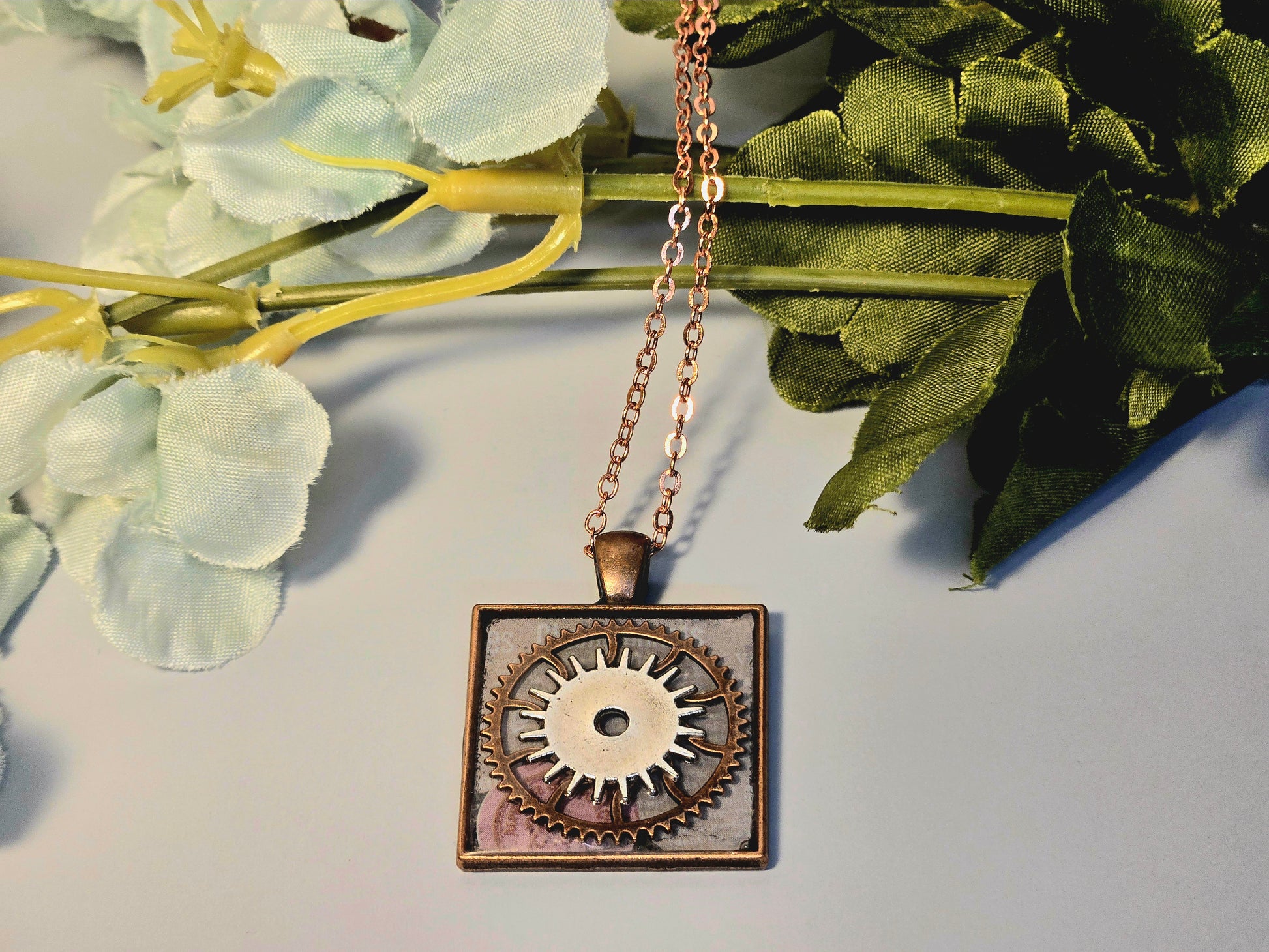 A symbol of time, invention, and endless curiosity, this square pendant necklace captures the heart of steampunk artistry. At its center, interlocking gears gleam with antique brass tones, framed in a bold design that feels both industrial and timeless.