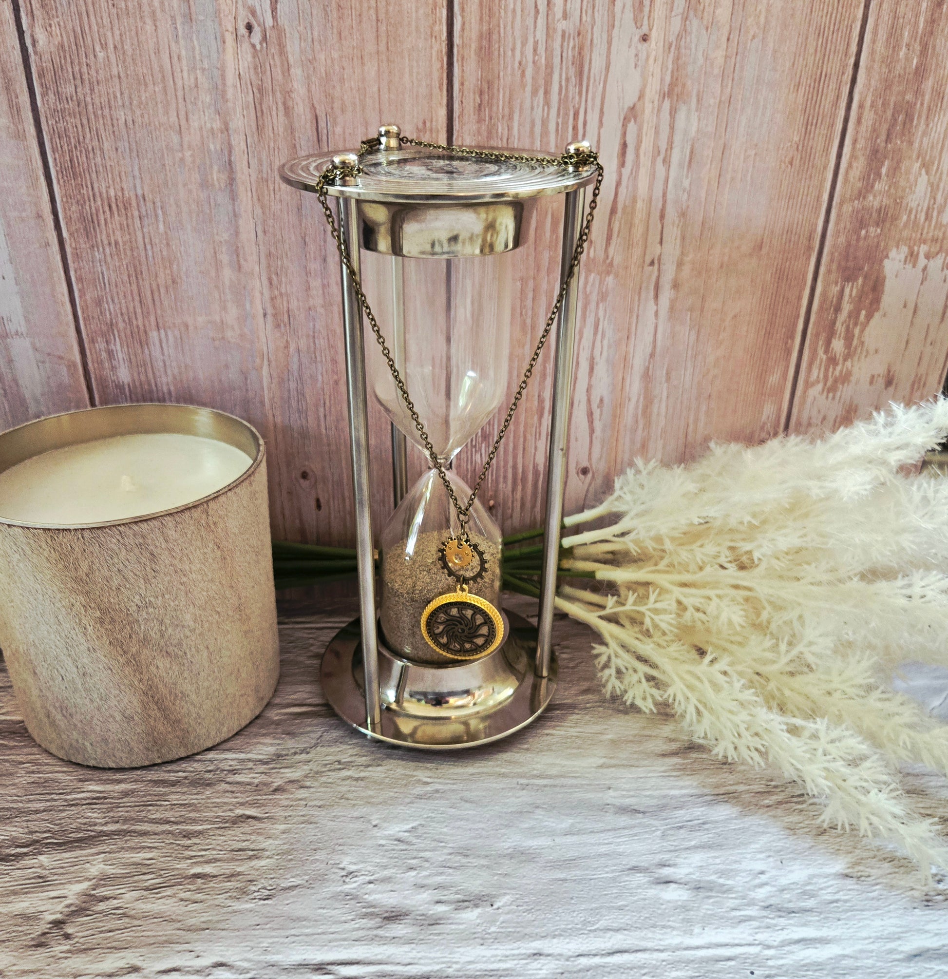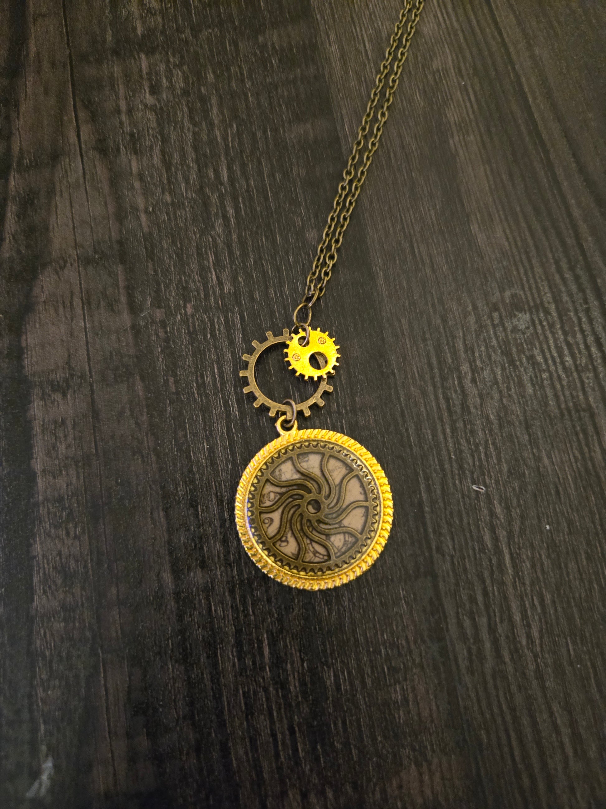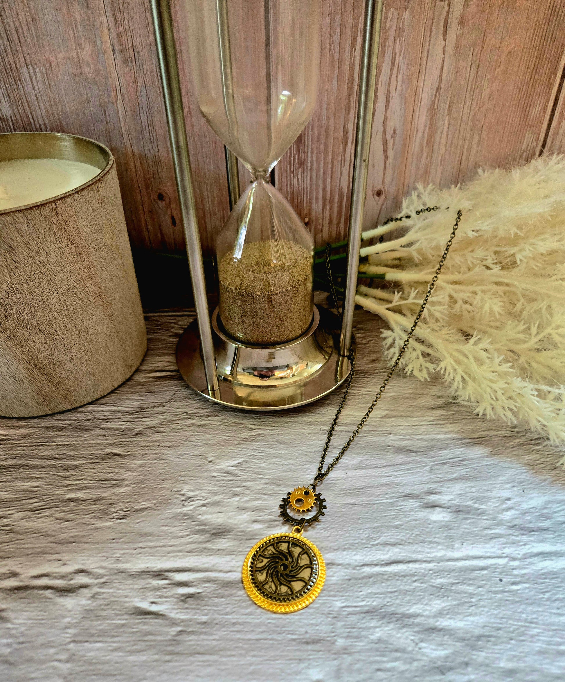 Bring a touch of steampunk style to your look with this gear and sun-inspired pendant necklace. Featuring an intricate swirling sun design framed in gold with a gear accent above, this necklace combines vintage charm with bold industrial detail.