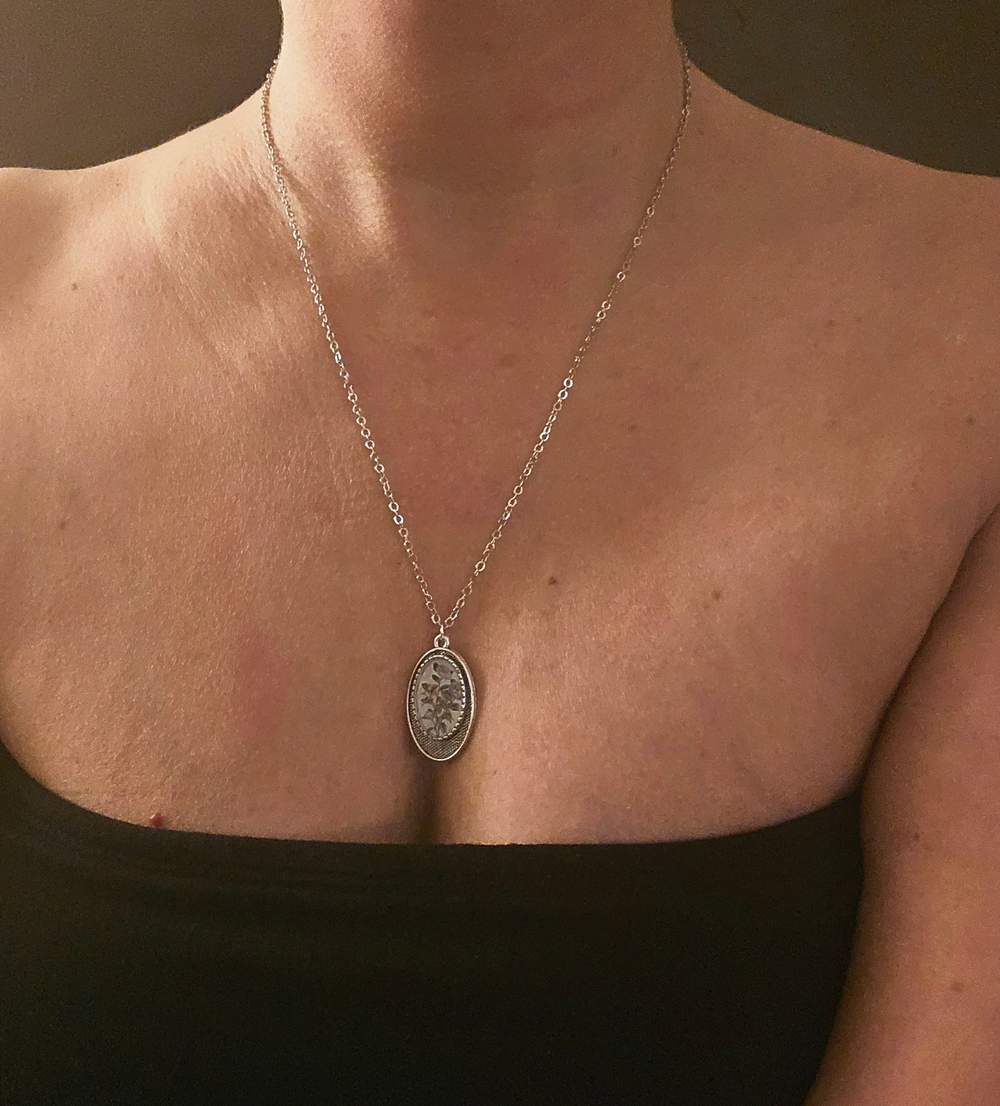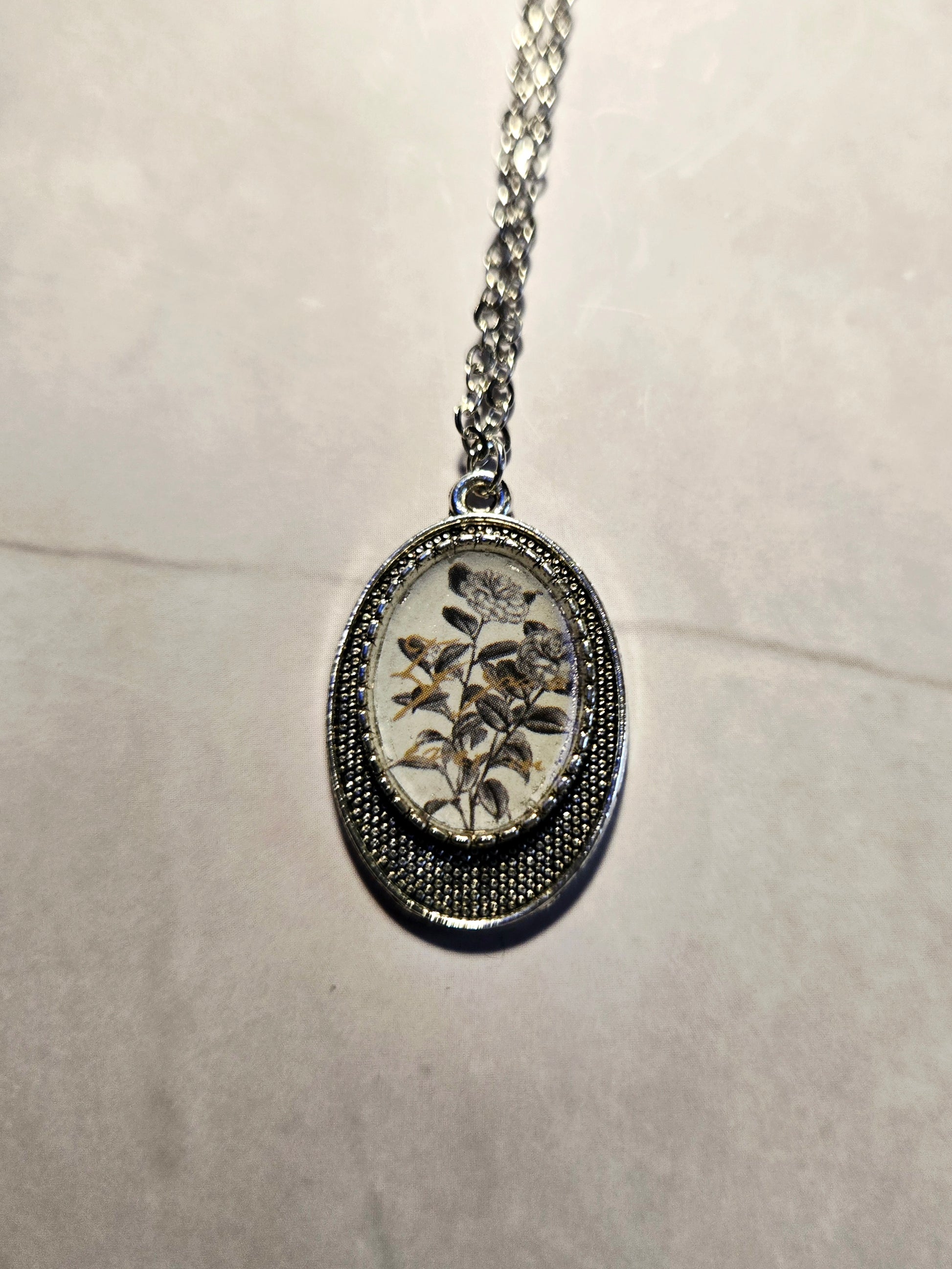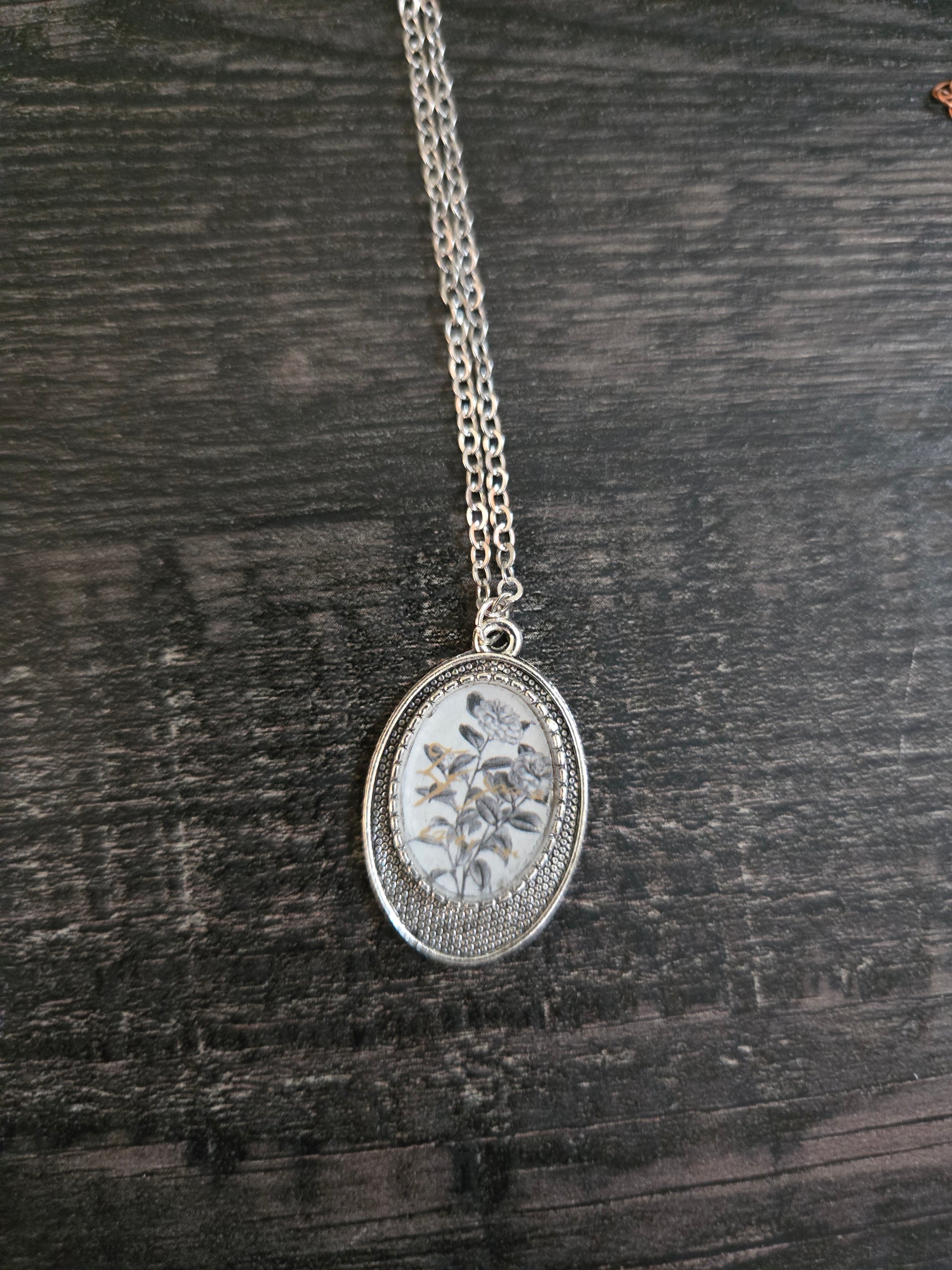 This handmade necklace features a vintage-inspired oval pendant with a delicate black and white floral design. The cameo-style setting is framed in a silver-tone border with intricate detailing, giving it a timeless and elegant look. Suspended on a matching silver chain, this necklace is versatile enough to complement both casual and formal outfits.
