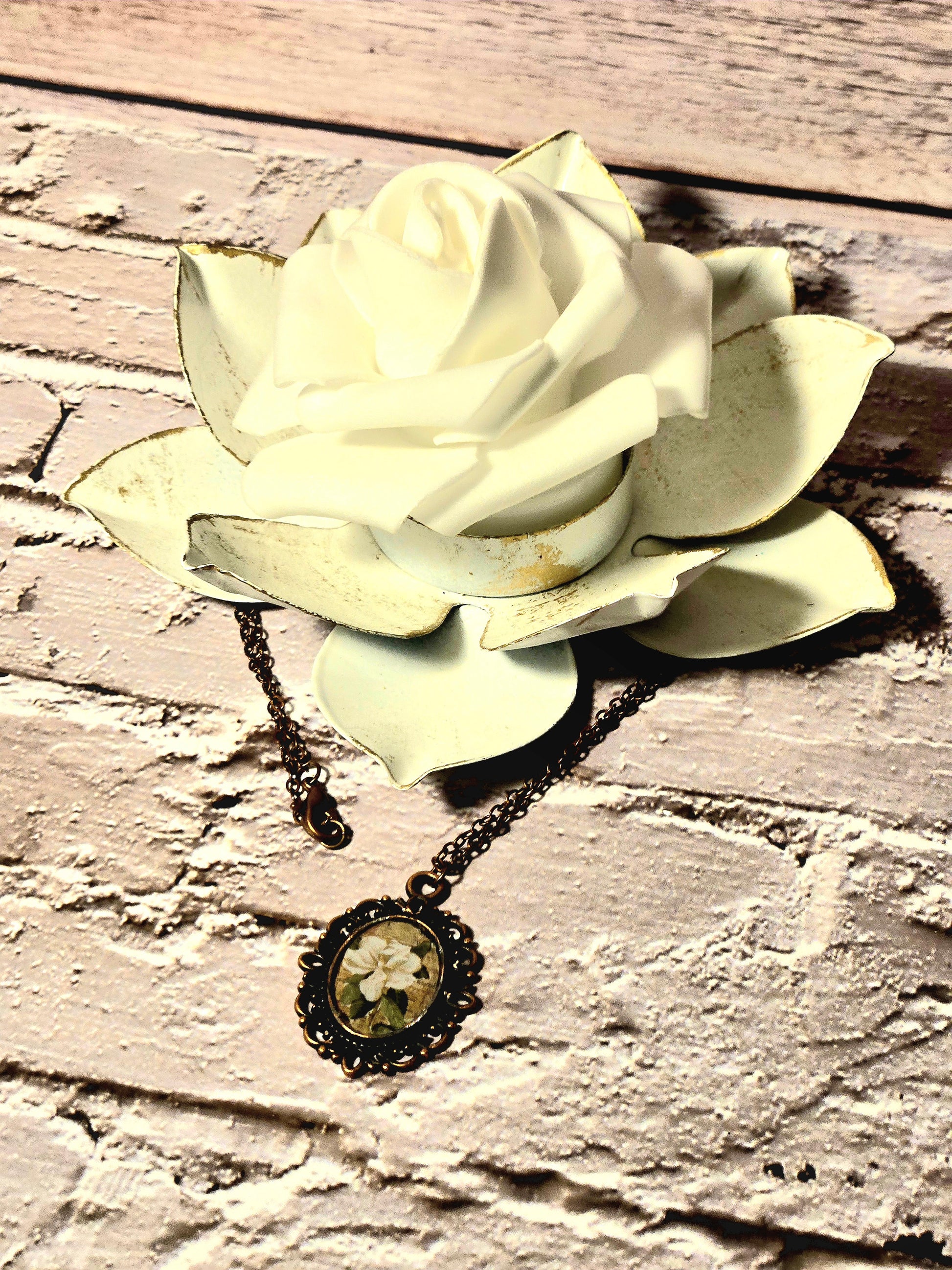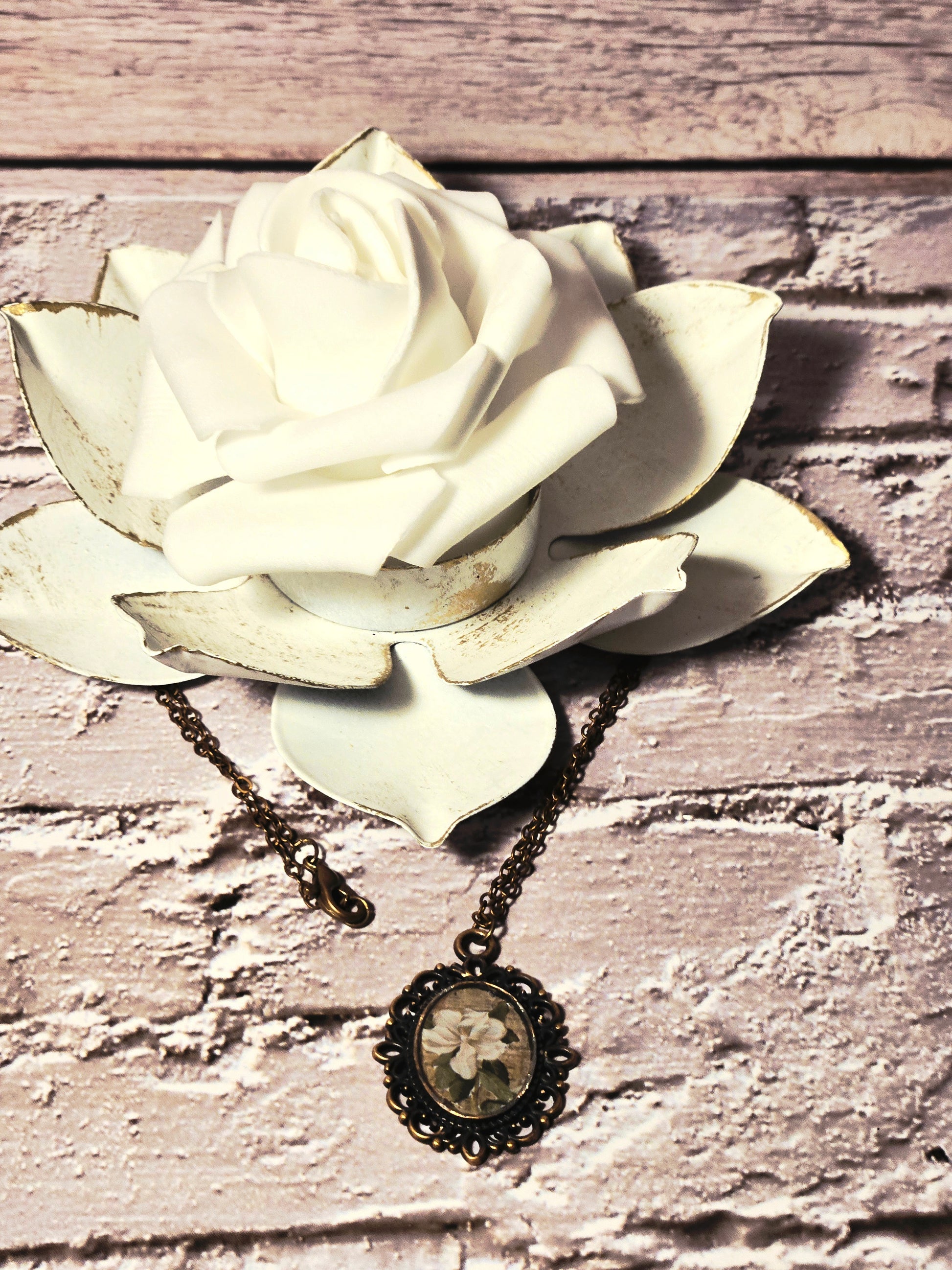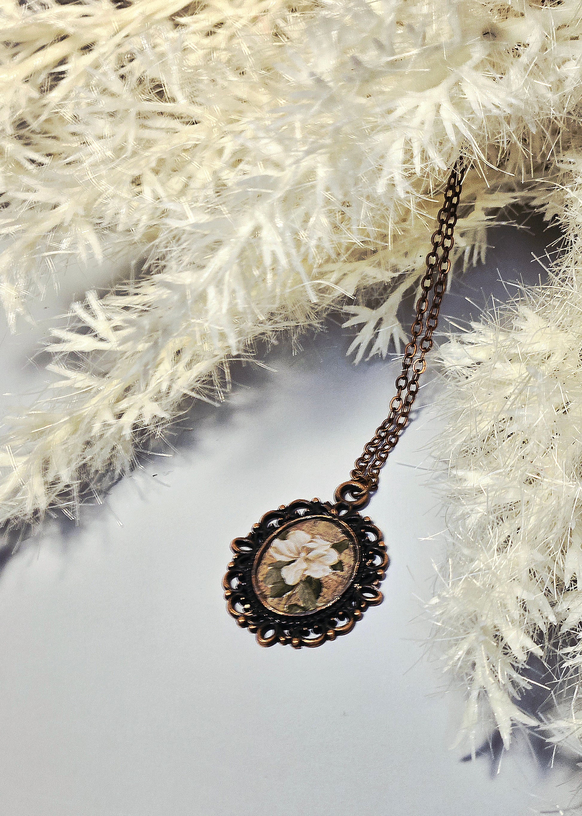 This Vintage Floral Bronze Pendant Necklace adds timeless beauty to any outfit. Featuring an oval charm with a soft white flower design framed in antique-inspired bronze filigree, this necklace radiates cottagecore elegance and romantic charm.