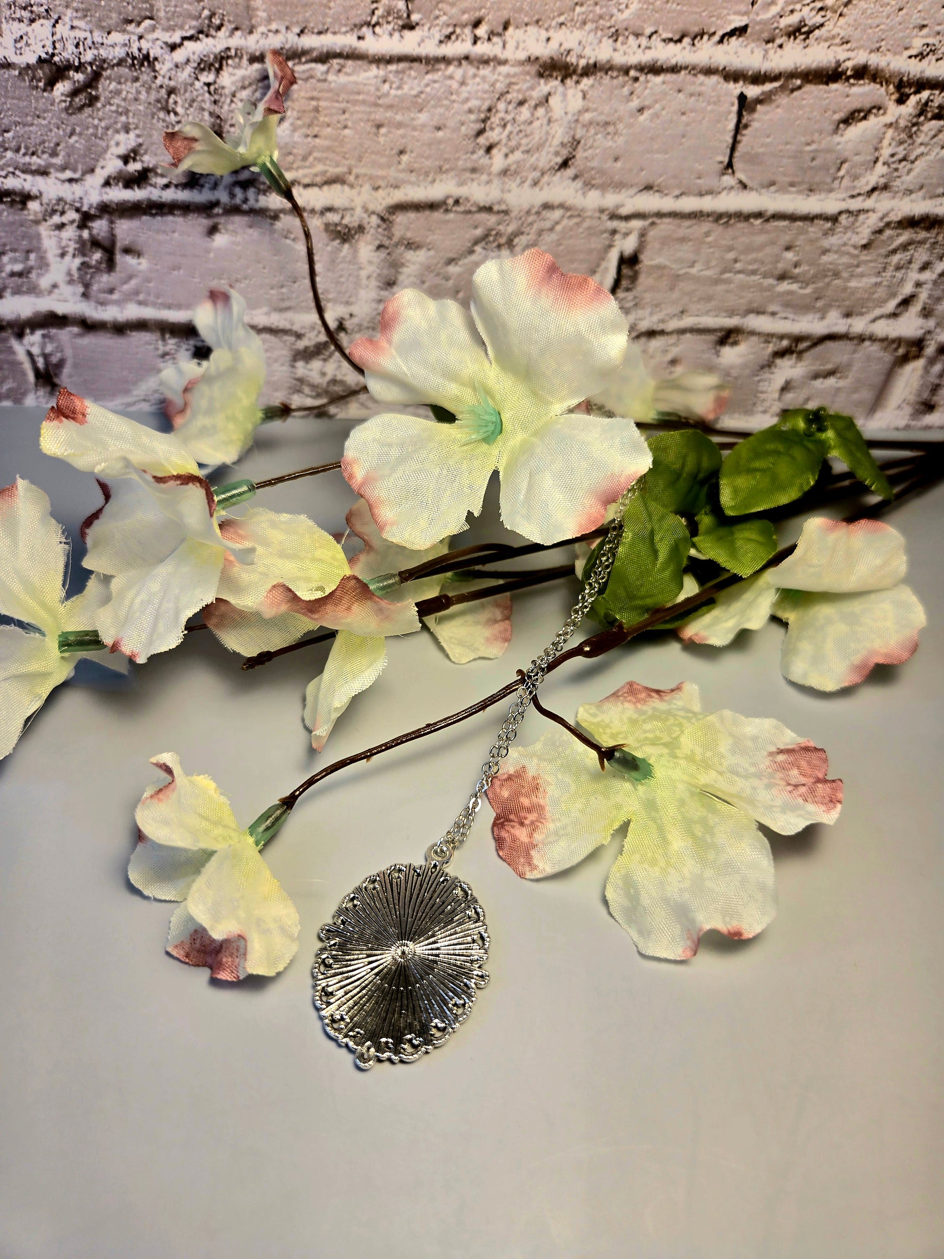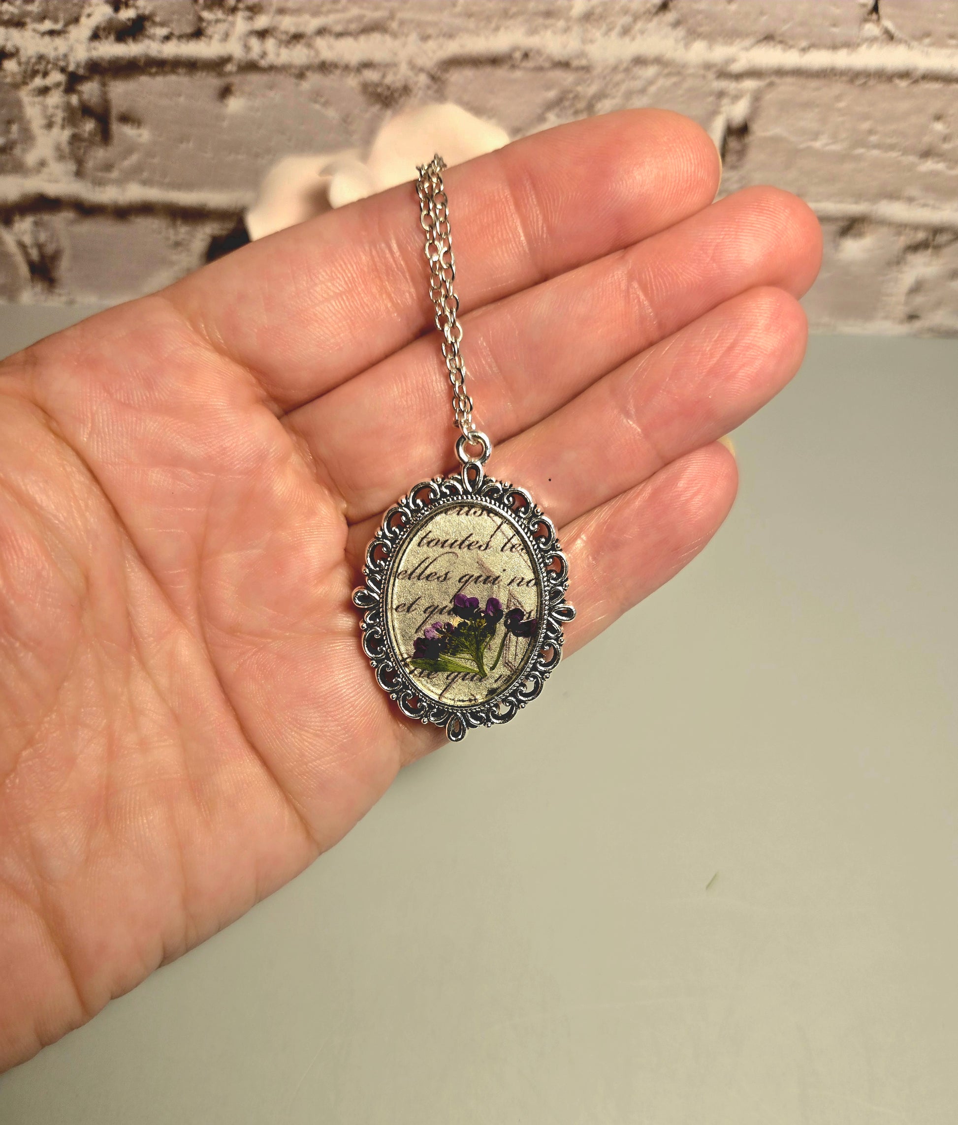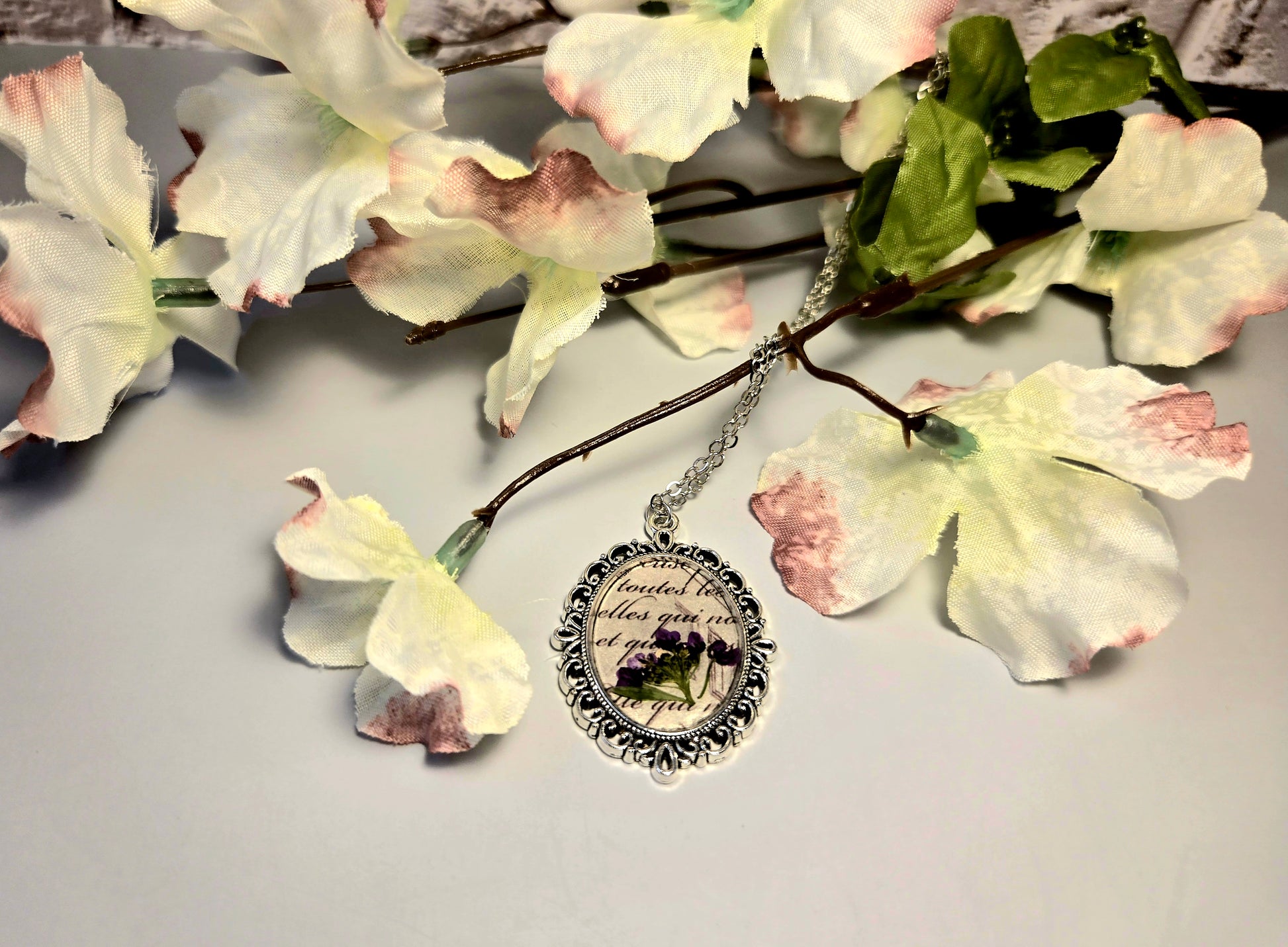 Capture timeless elegance with this beautifully handcrafted vintage-style necklace. Featuring real pressed purple flowers set against a delicate script background, this oval pendant is framed in an ornate antique silver bezel.