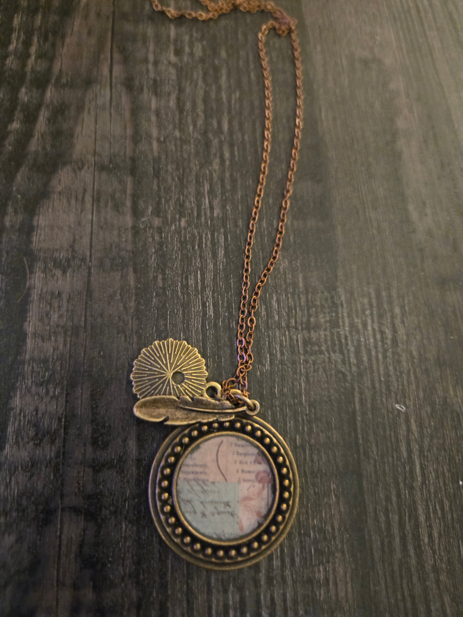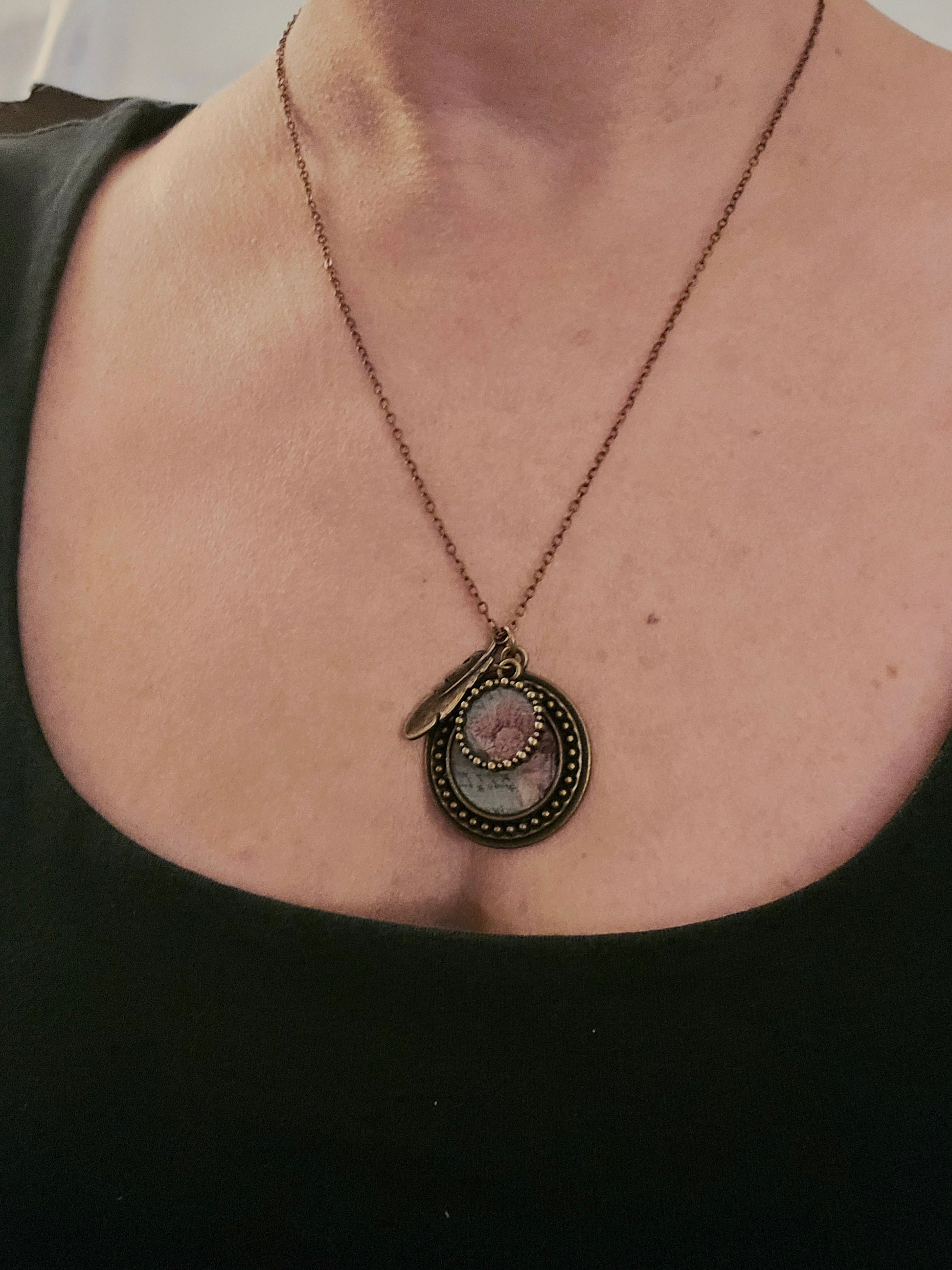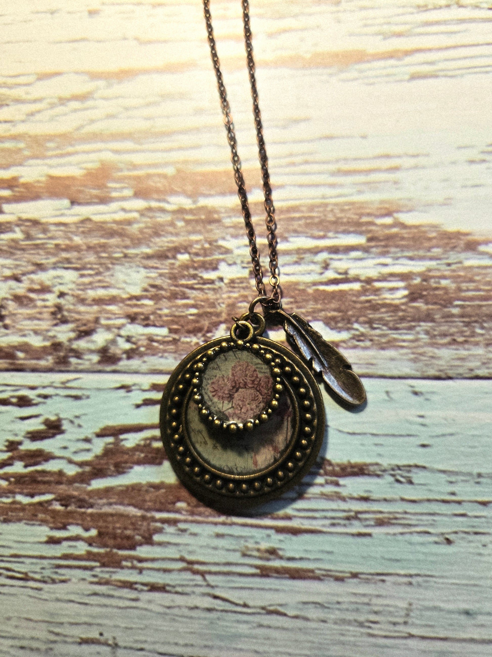 Delicate and unique, this vintage floral pendant necklace captures the beauty of nature with a timeless design. The pendant features a soft pink flower illustration under a glass cabochon, framed in a layered antique brass circle with beaded detailing. A small feather charm adds a whimsical, boho touch, making this piece both romantic and earthy.