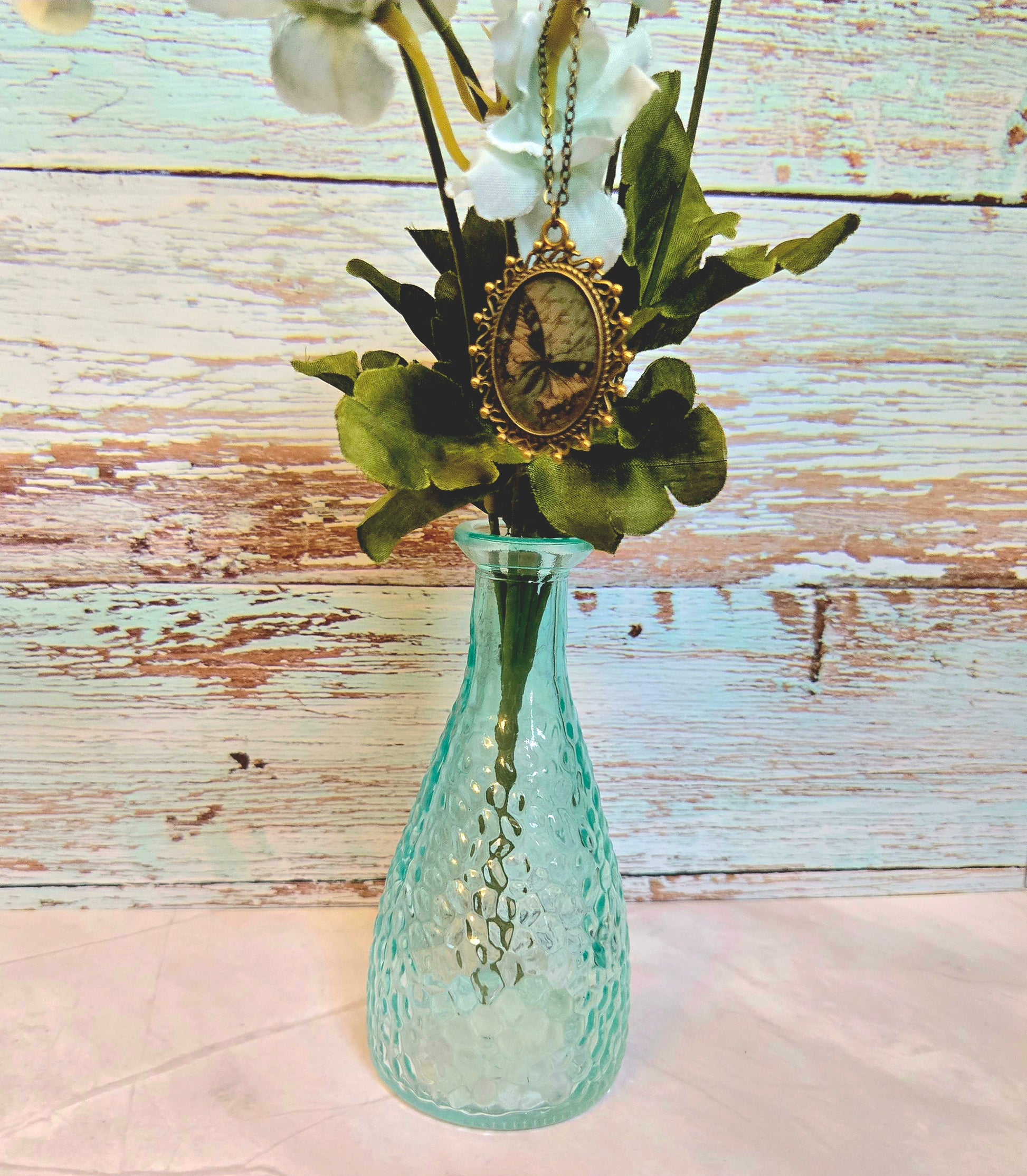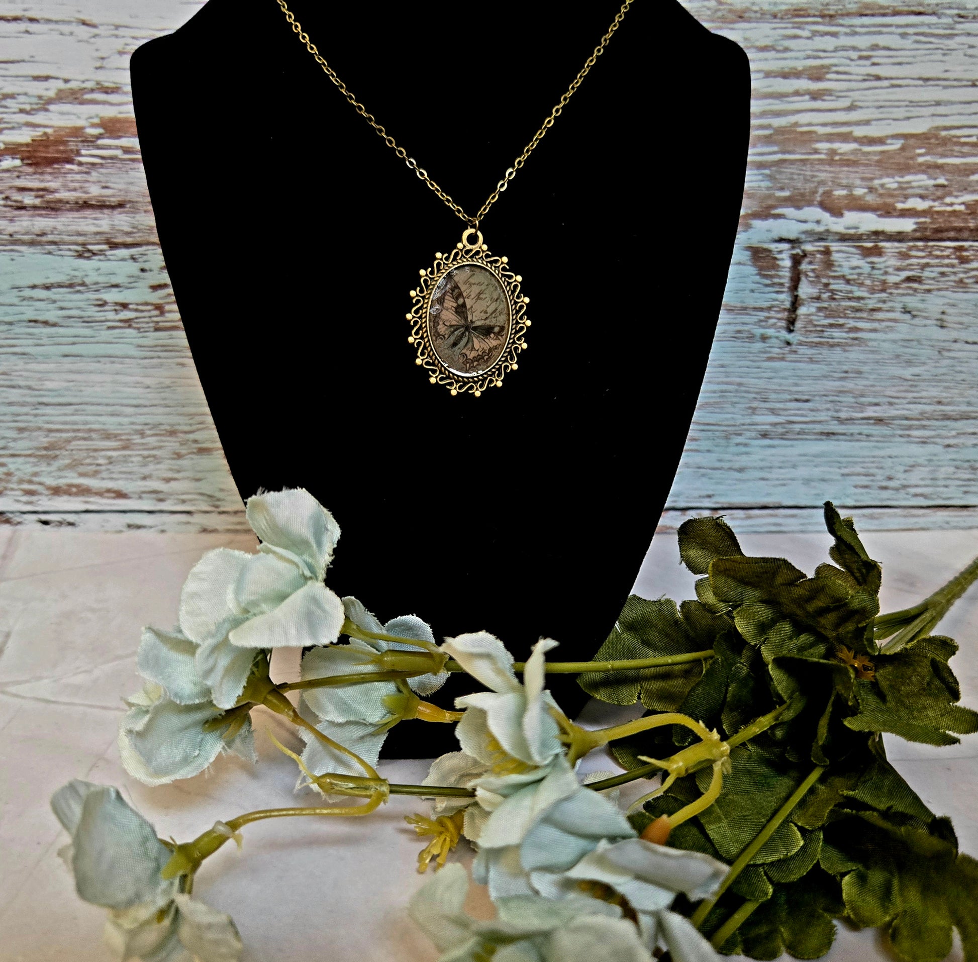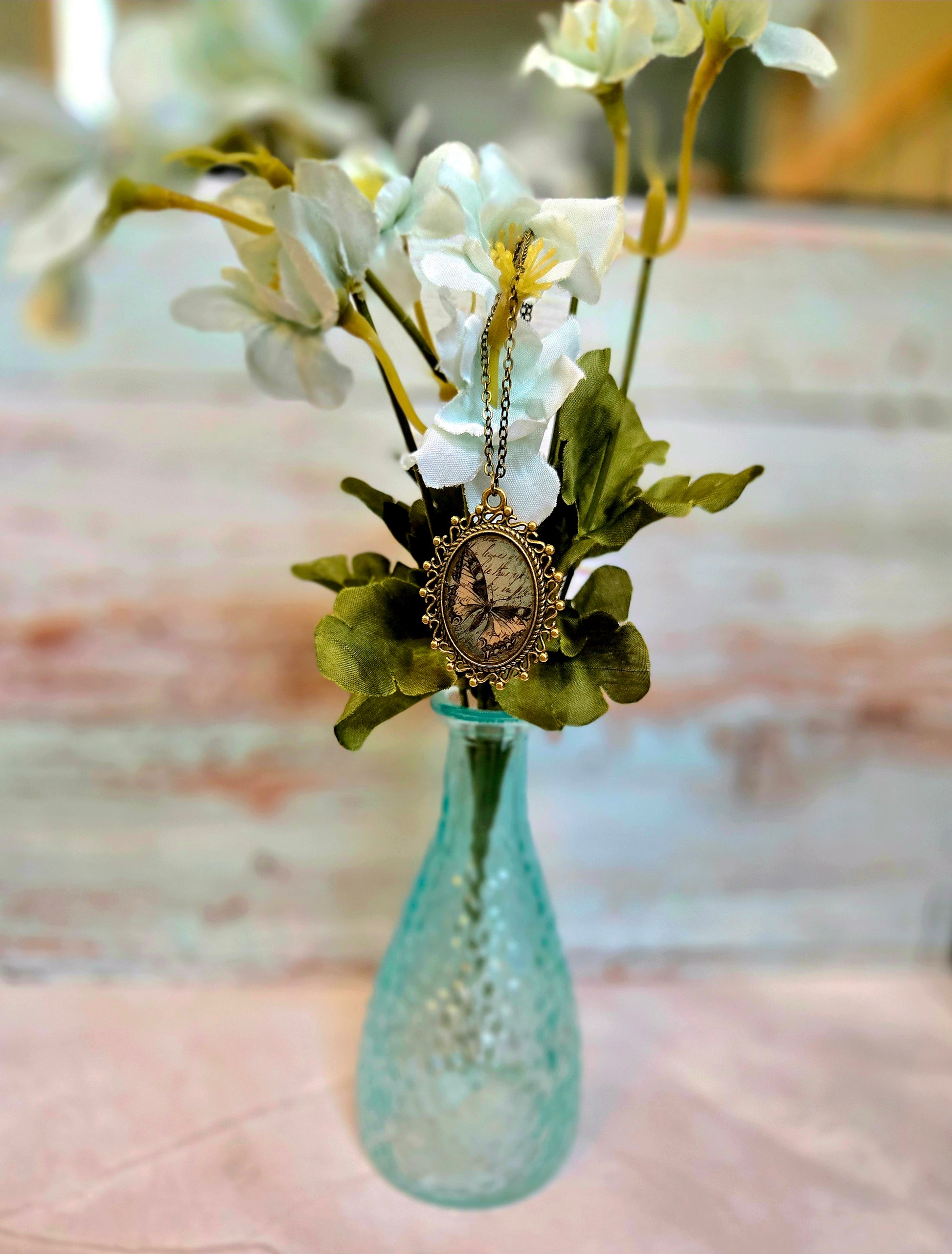 The delicate butterfly illustration is framed by an antique gold filigree bezel that adds timeless elegance. Suspended on a classic chain, this piece evokes a sense of romantic nostalgia, perfect for lovers of nature, poetry, and all things feminine.