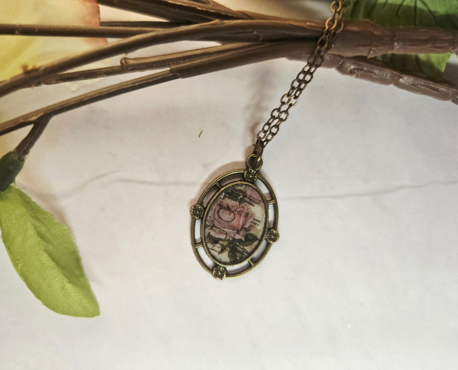 The Vintage Rose Music Pendant Necklace is a gentle ode to romance, memory, and the beauty of soft things. Set in a brass-toned openwork oval frame with delicate floral accents, this pendant features a pink rose layered over faded sheet music — like a secret note from the past, tucked away in a forgotten journal.