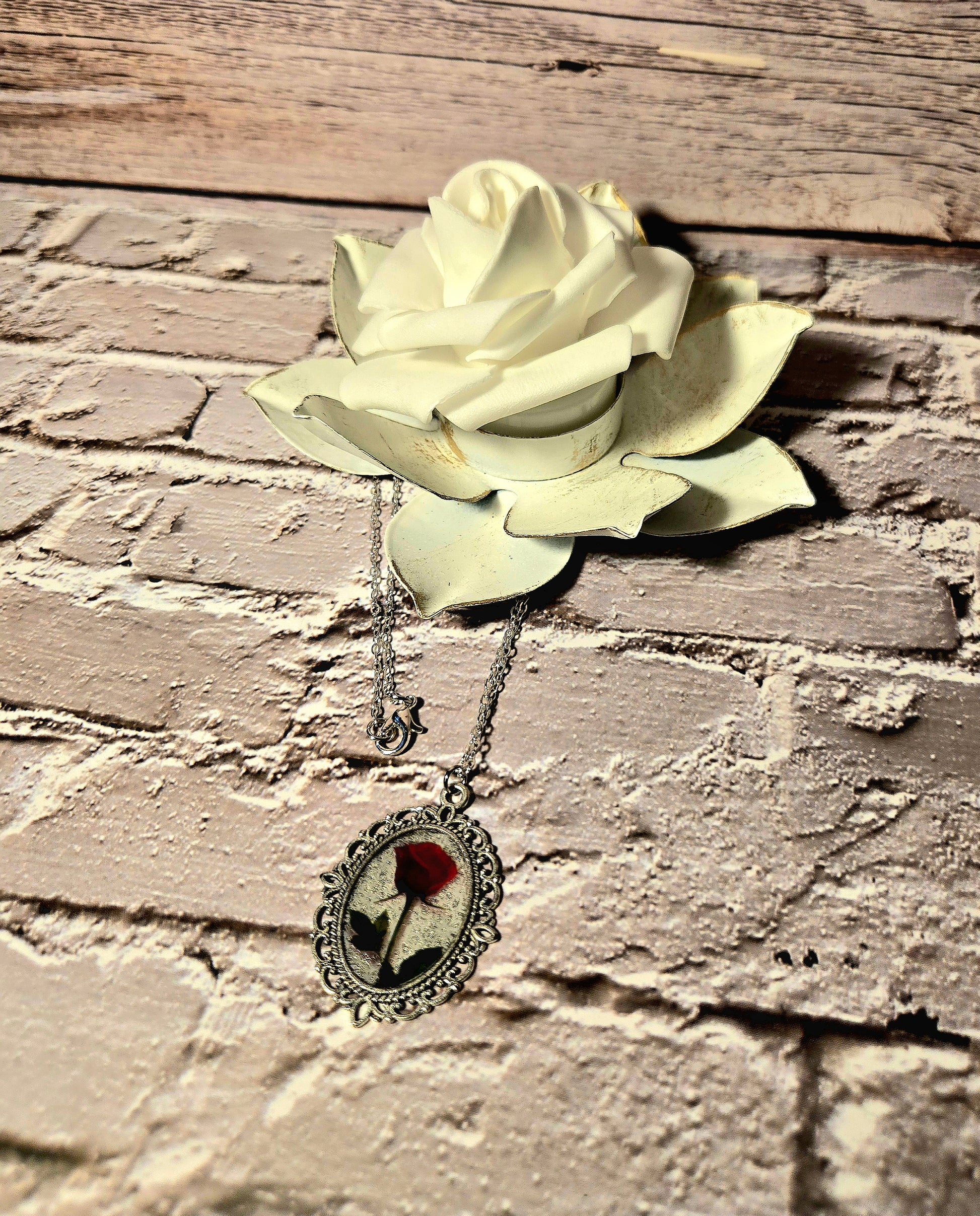Featuring a delicate red rose set against a vintage-patterned background, the pendant is framed in an ornate silver filigree bezel that adds a touch of Victorian charm.